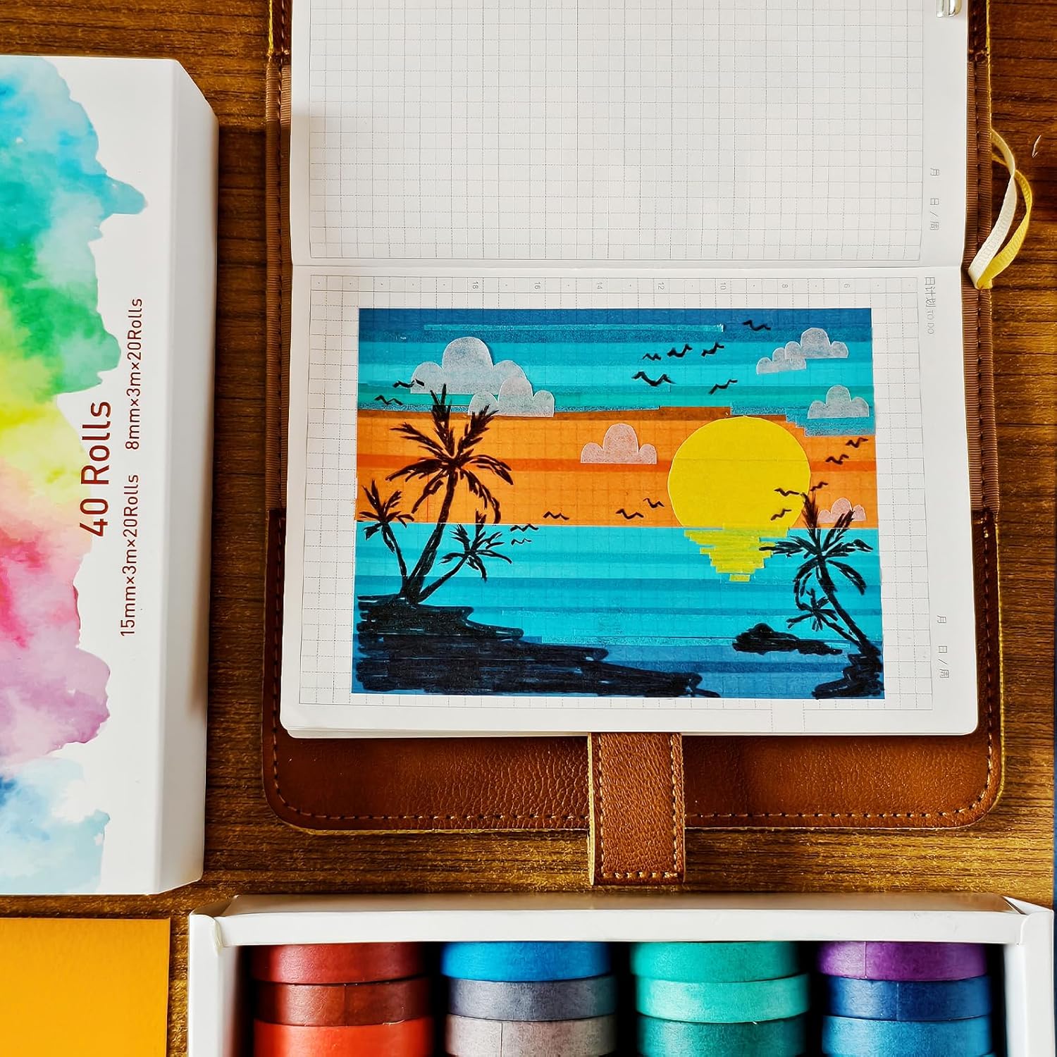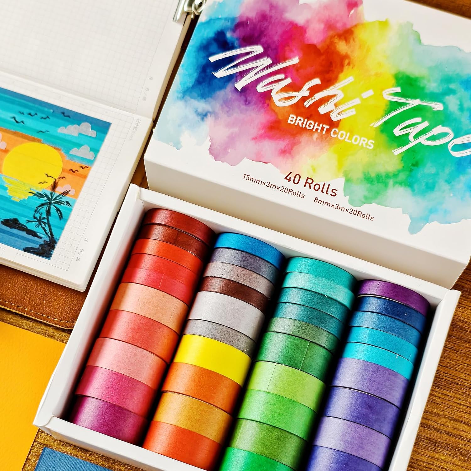 - Ignite your imagination with 40 vibrant rolls of rainbow washi tape, spanning from fiery reds to dreamy purples. A perfect palette for scrapbooking lovers and creative spirits alike