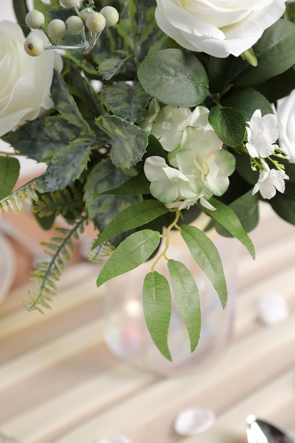 - Package Including:42pcs with 8 Kinds;fern leaf x15,Little Hydrangea x5,greens berry x3,Greenery Buds x2,Willow Leaf x10,bay leaf x3,mulberry leaf x4,