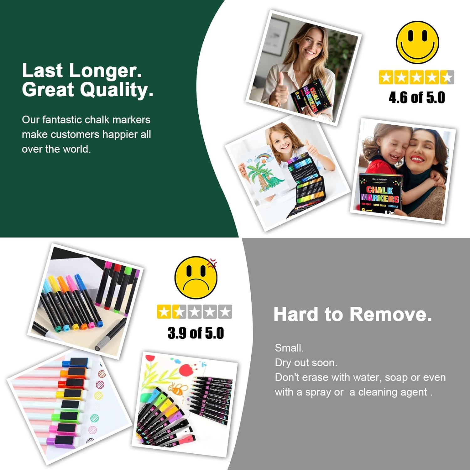 - High Quality. The chalkboard markers come with more volume of ink, nontoxic, odorless, and dust-free, made of premium quality, last in a long time.