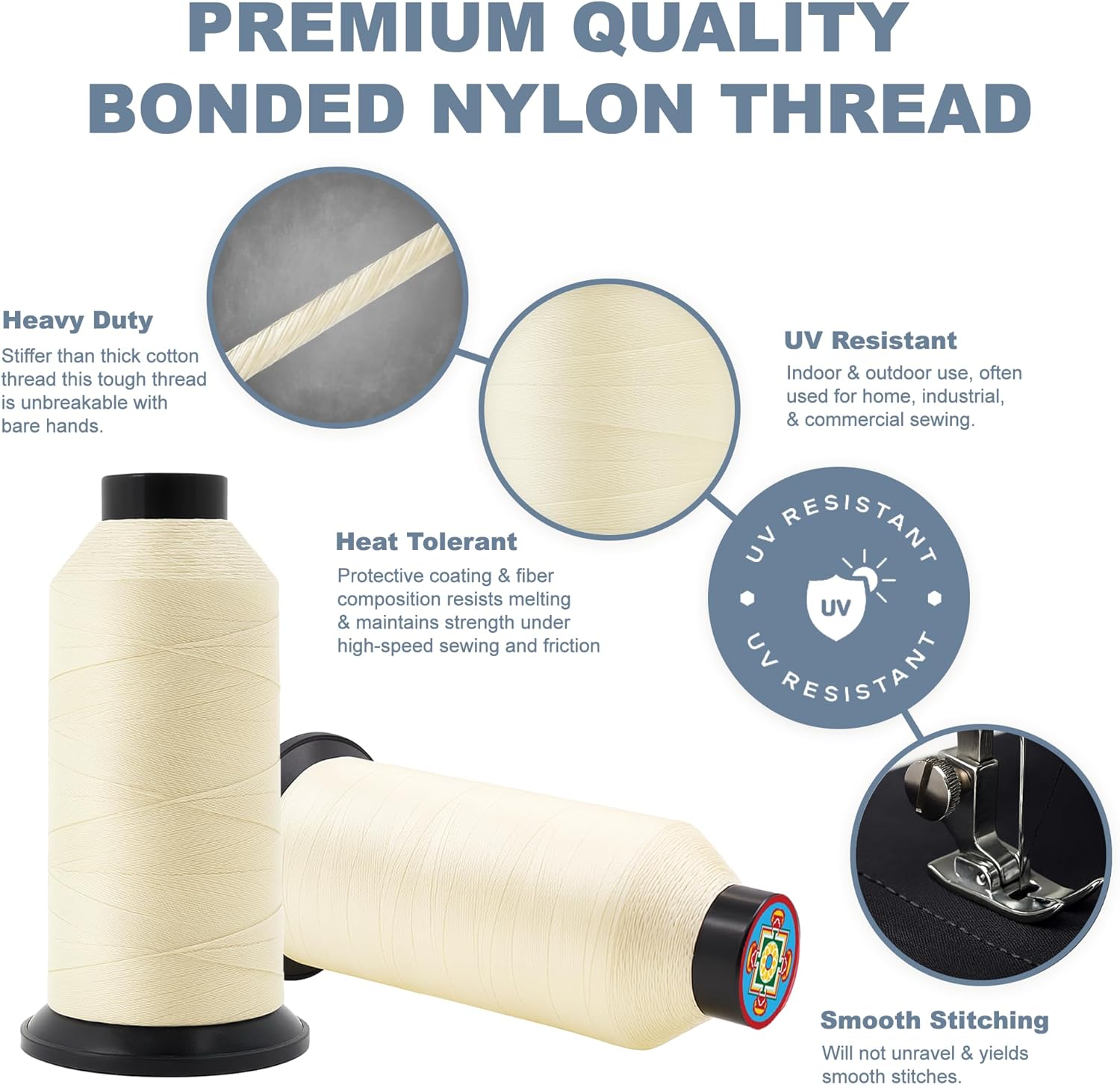- UV Resistant Thread: Often used as home & industrial sewing thread & commercial sewing thread, the waterproof ivory nylon thread provides long-lasting stitching to boat & auto covers, shoes, boots, sails, bags, tents, awnings, & outdoor furniture.