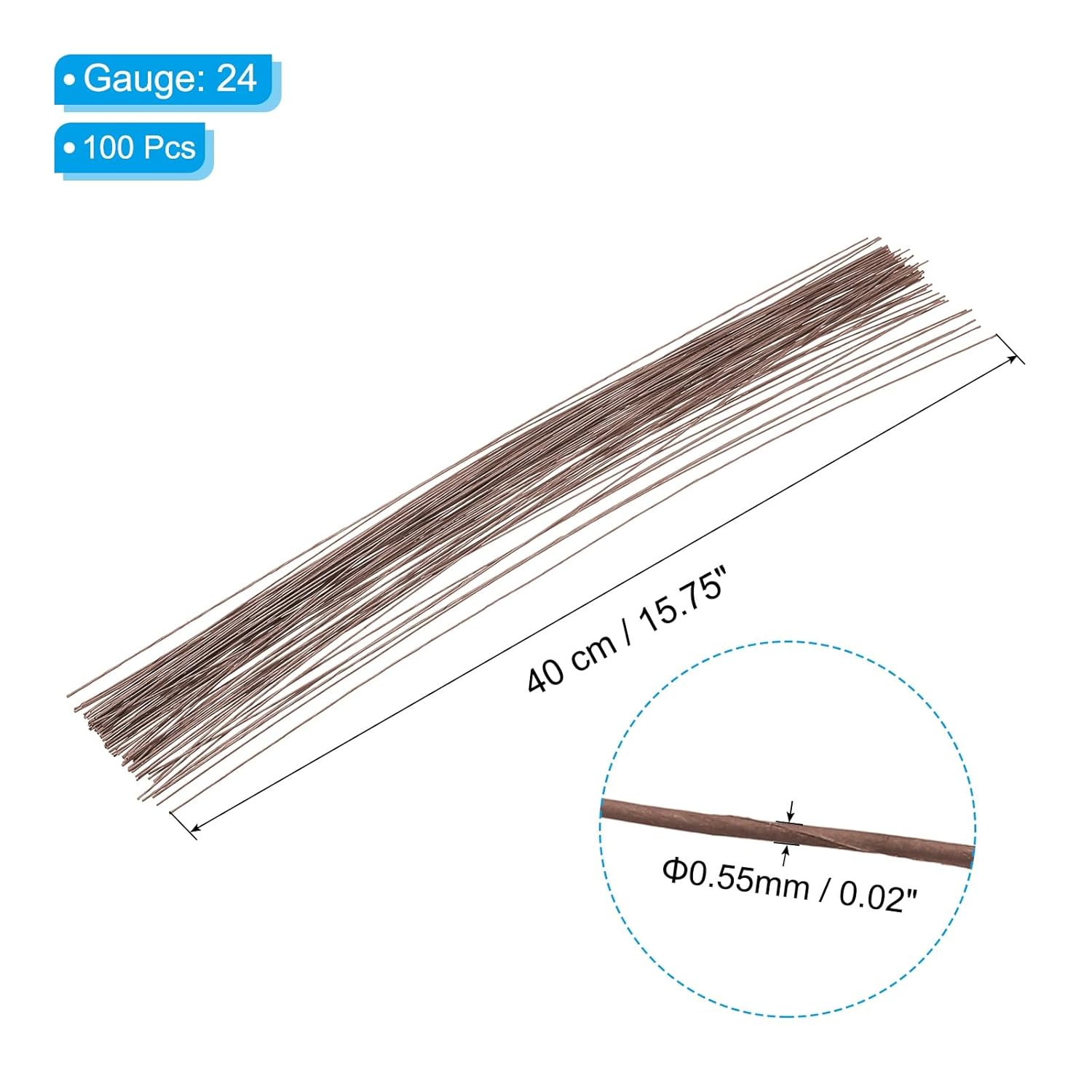 - Color: Brown; Gauge: 24; Wire Length: 40 cm / 15.75 inch; Wire Diameter: 0.55 mm / 0.02 Inch; Packing List: 100 x Floral Stem Wire
