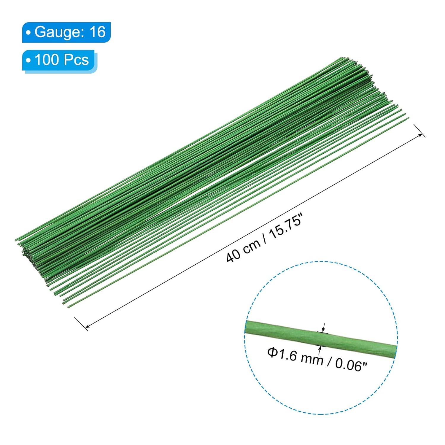 - Color: Light Green; Gauge: 16; Wire Length: 40 cm / 15.75 inch; Wire Diameter: 1.6 mm / 0.06 Inch; Packing List: 100 x Floral Stem Wire