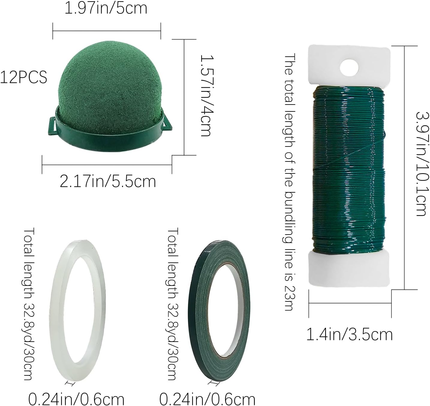 - Floral foam stand set: 12 pcs mini round floral foam stands (1.97X1.57 inches), 1 roll of 25 yards of green floral line, 2 rolls of tape, the set meets your daily floral decoration needs
