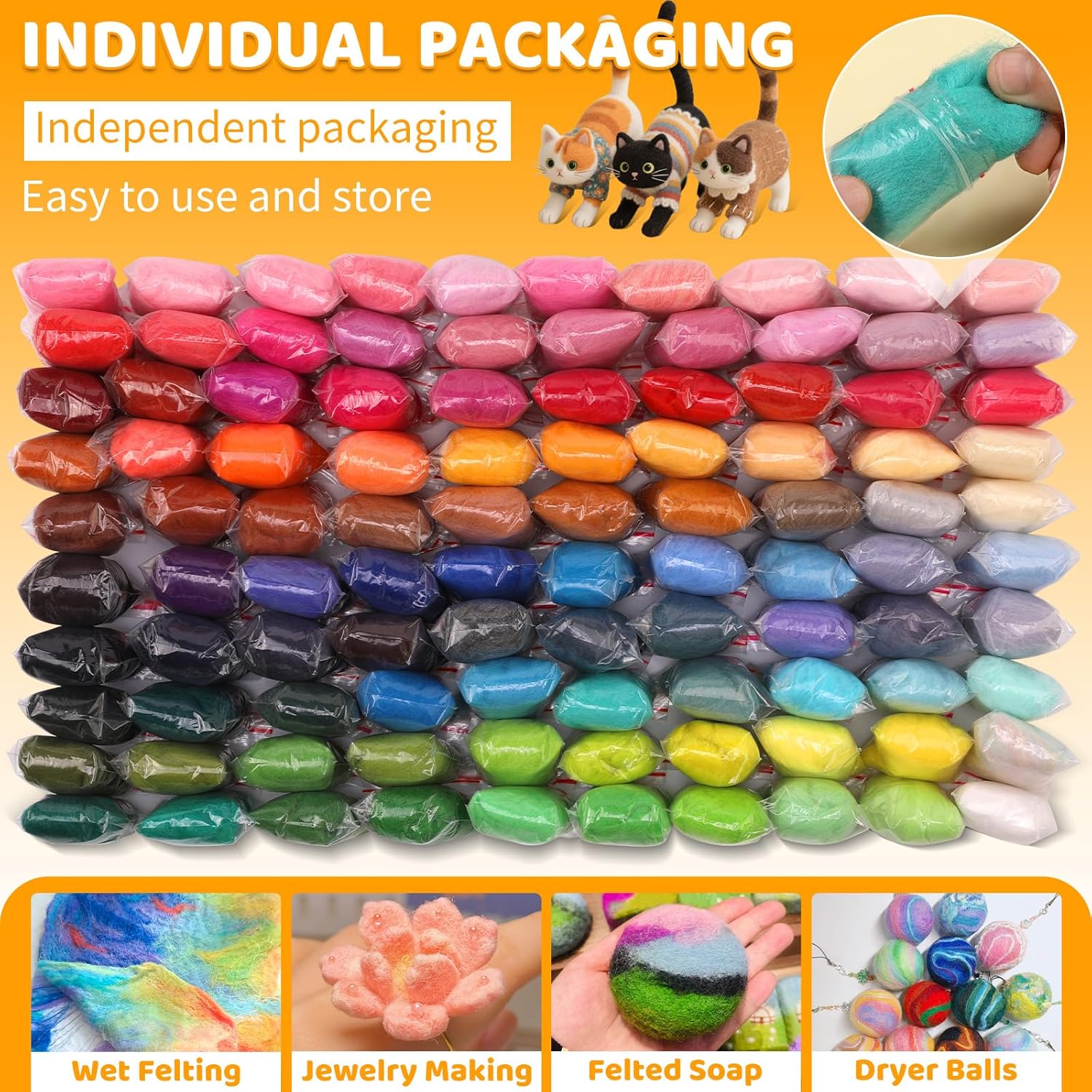 - 100 Vibrant Colors: This set of needle felting wool will come in a total of 100 different colors. It would be a good helper for your process of needle felting which allow you to select the colors that you really need from many different colors