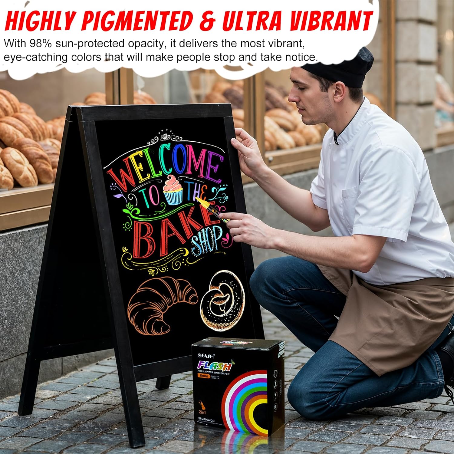 - 【More Vibrant Colors】SFAIH 24-color chalk markers for blackboard uses high-concentration Italian ink to cover any background effortlessly, visible up to 50 feet with neon-like brightness. 4 metallic chalk markers shades infused with pearlescent particles deliver gilded finishes for calendars or window art. Liquid chalk markers premium pigment formula withstands 21 days of outdoor weathering and sunlight while maintaining original vibrancy.