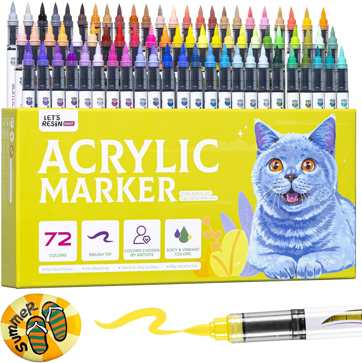 LET'S RESIN PAINT Acrylic Paint Markers Brush Tip 72 Colors,Automatic Ink Control Acrylic Paint Pens,No Bleed & Good Coverage Acrylic Markers for Coloring Books,Rock Painting,Canvas,Ceramic,Wood