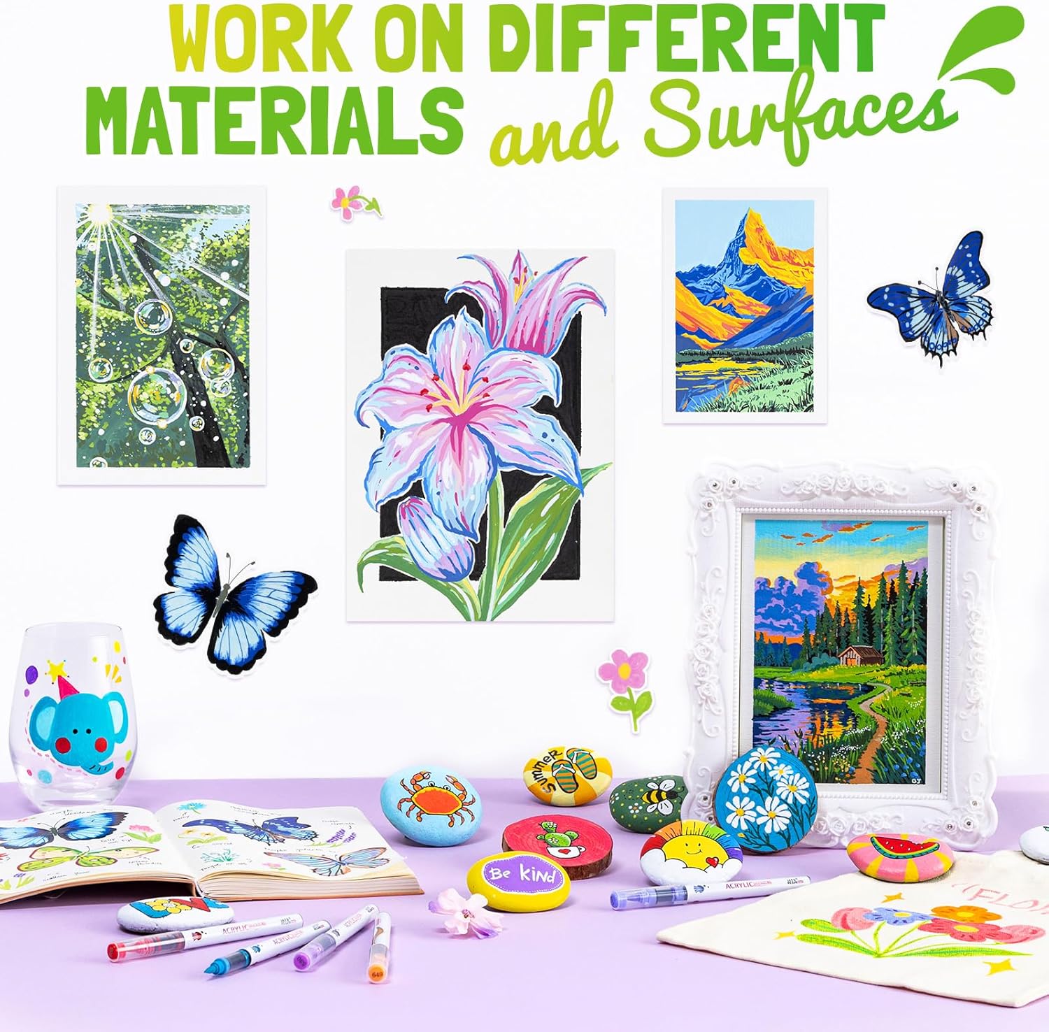 - High Quality Water-Based Ink:Our acrylic paint markers with high quality, low odor, non toxic, quick drying,waterproof,vibrant ink that is fade resistant and does not bleed through the paper.The ink adheres well to various surfaces,including paper,rock, wood, ceramic, glass, canvas, and more.