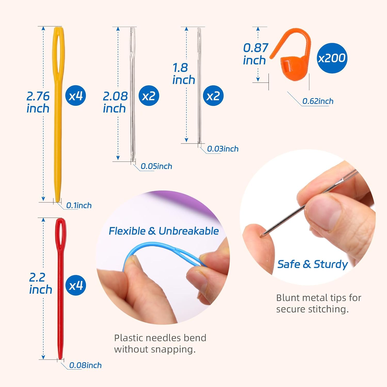 - 【All-in-One Crochet Accessories Set】 This 200PCS crochet stitch markers set includes colorful locking stitch markers for crocheting, 8 plastic yarn needles (2 sizes, 4 each), and 4 blunt metal sewing needles (2 sizes, 2 each)—everything you need for your crochet and knitting projects.