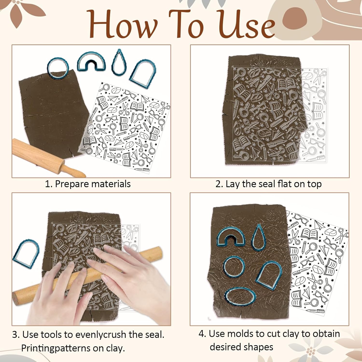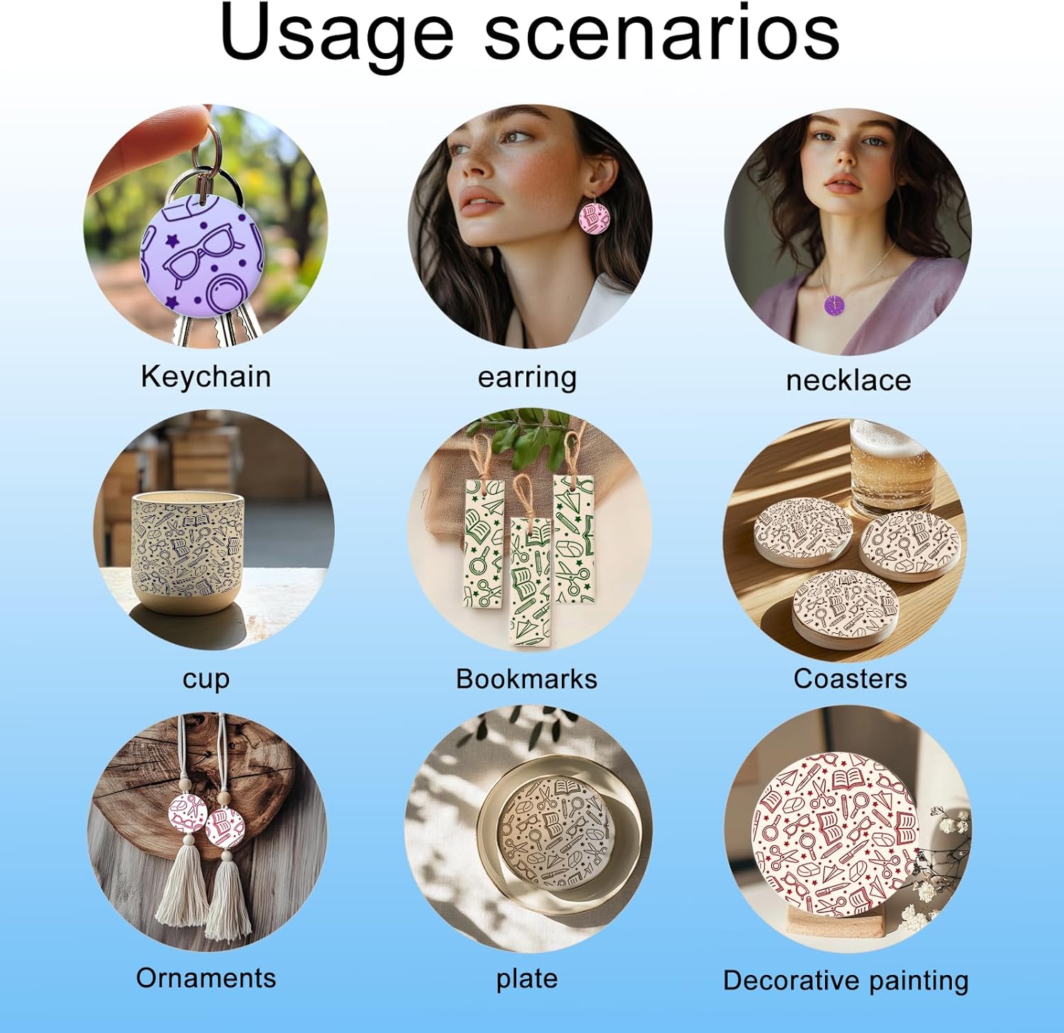 - School Elements Design: The school elements polymer clay texture sheet for clay jewellery making is very delicate and beautiful. Including book, pencil, pen, magnifying glass, eraser, glasses pattern. Perfect for jewellery and other small objects, the school elements design meets a variety of your creative needs, giving your creations a touch of personality and creativity