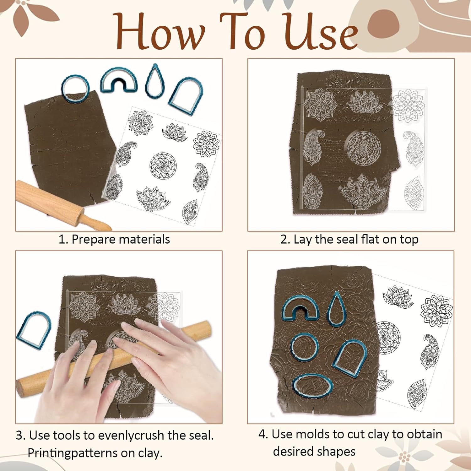 - How to Use: Roll the prepared polymer clay into flakes and place it on the clay texture mat and roll it on top to get a clear solid texture, and then colour it with a variety of colours. This clay texture stamp is beautifully detailed and is the perfect finishing touch to a clay plate