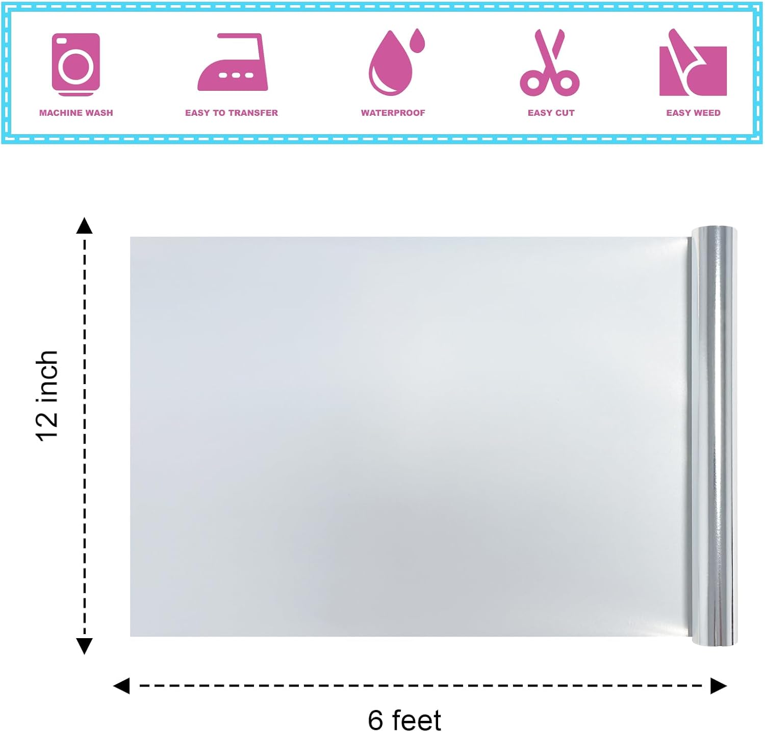 Metallic Silver Foil Heat Transfer Vinyl 12Inch*6Ft Bundle Chrome HTV Pack in Vibrant Colors for Stunning T-Shirt Designs! Perfect for DIY Heat Transfer Vinyl (Silverr, 12Inch*6Ft)