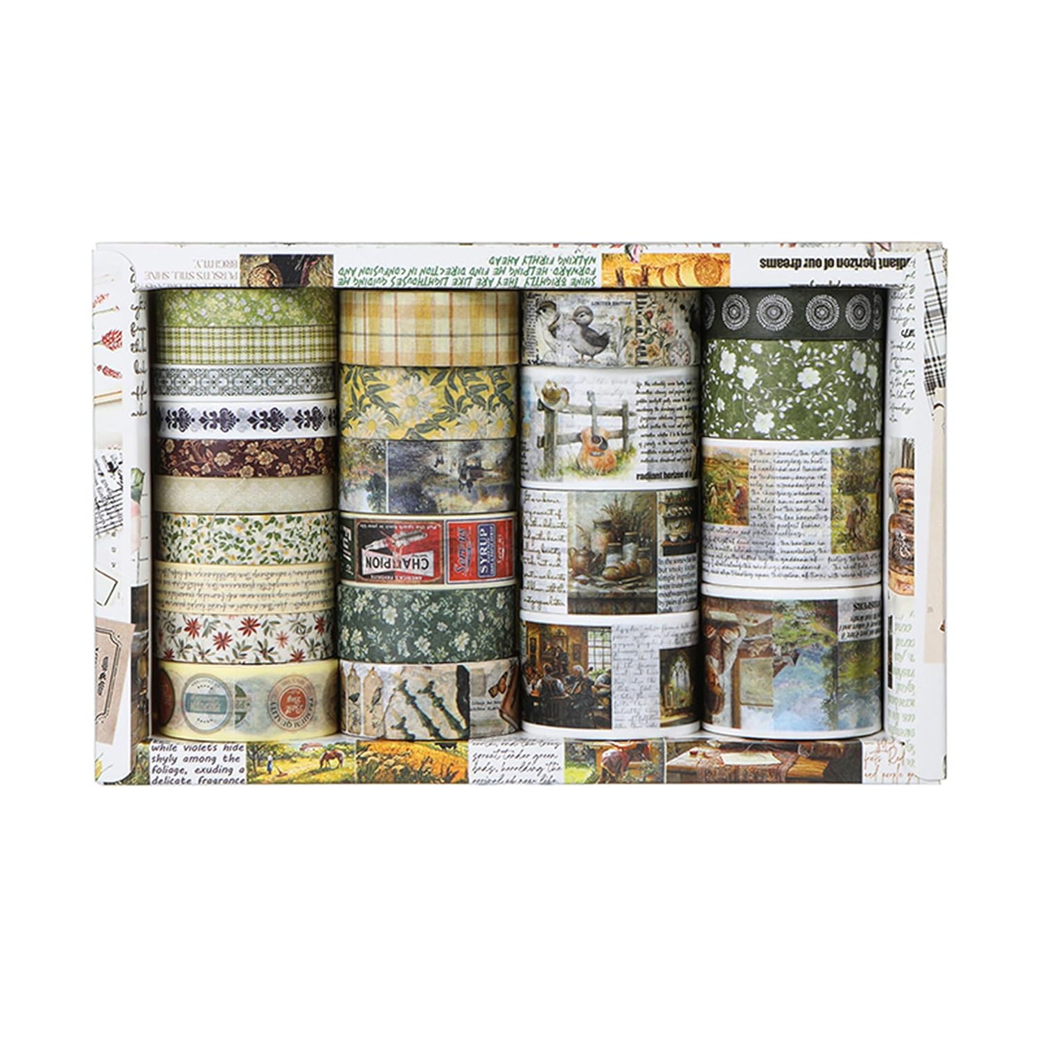 - 👍【CLASSIC AESTHETIC DESIGN】Immerse your projects in nostalgia with 24 unique washi tape rolls, each featuring a different retro-inspired pattern. From antique floral prints and old postcards to vintage maps and faded manuscripts, every roll adds a touch of timeless charm to your crafts