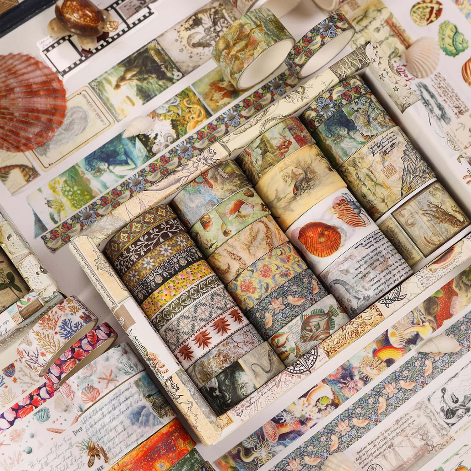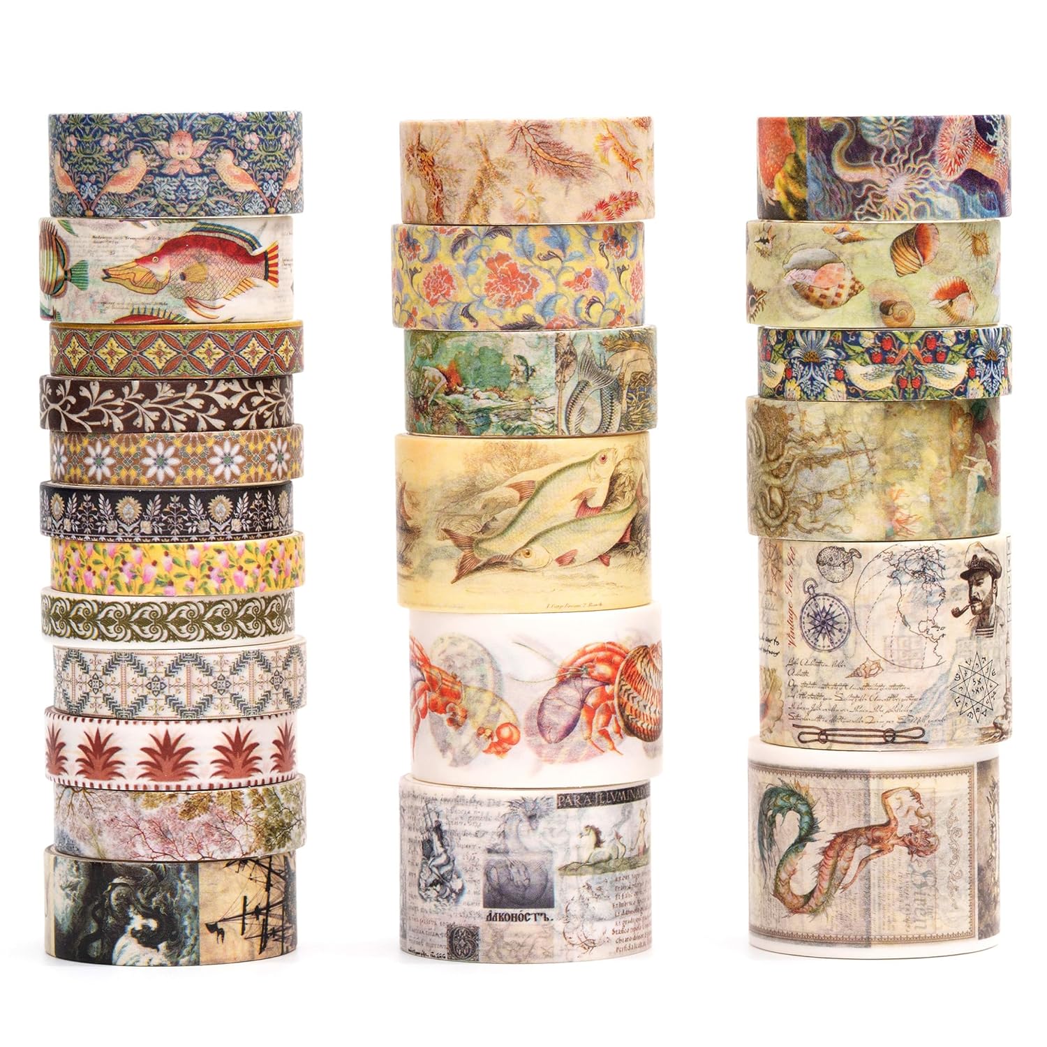 - 👍【CLASSIC AESTHETIC DESIGN】Immerse your projects in nostalgia with 24 unique washi tape rolls, each featuring a different retro-inspired pattern. From antique floral prints and old postcards to vintage maps and faded manuscripts, every roll adds a touch of timeless charm to your crafts