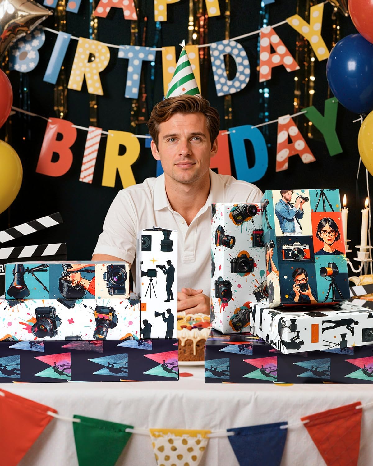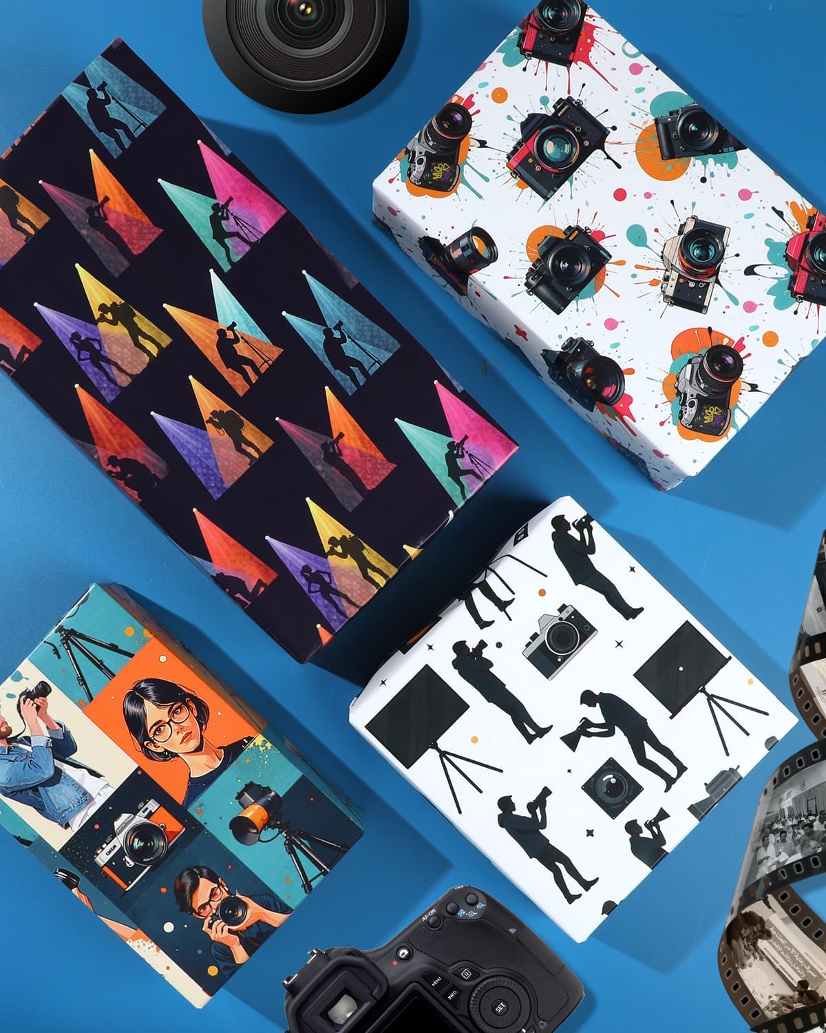 - PHOTOGRAPHER DESIGN: Our wrapping paper is beautifully printed with a captivating assortment of photography elements: classic cameras, sturdy tripods, cherished photo albums, and some photography scenes. The stylish design creates a visually appealing and thoughtful aesthetic, perfect for birthdays, graduations, photography enthusiasts, and adding a personal touch to any gift. Wonderful supplies for gift wrapping, birthdays, photographer gifts, and more!