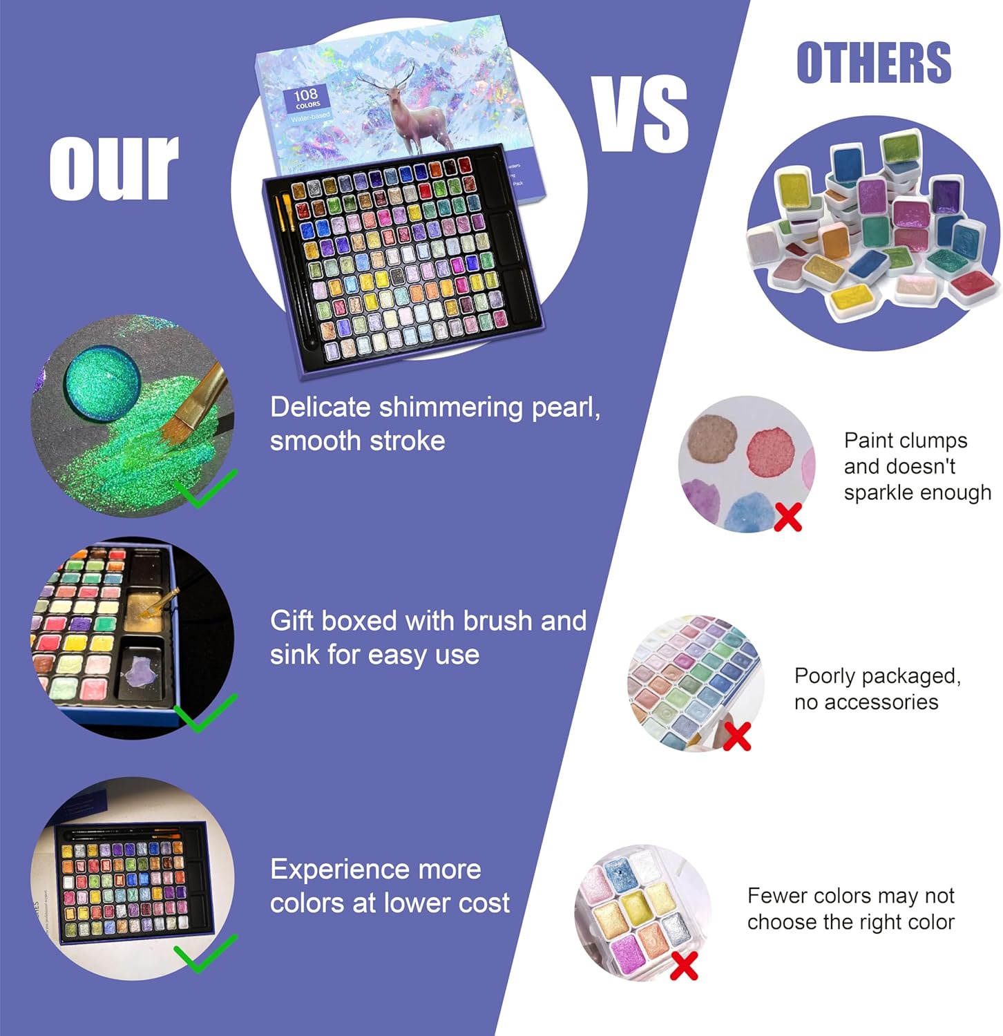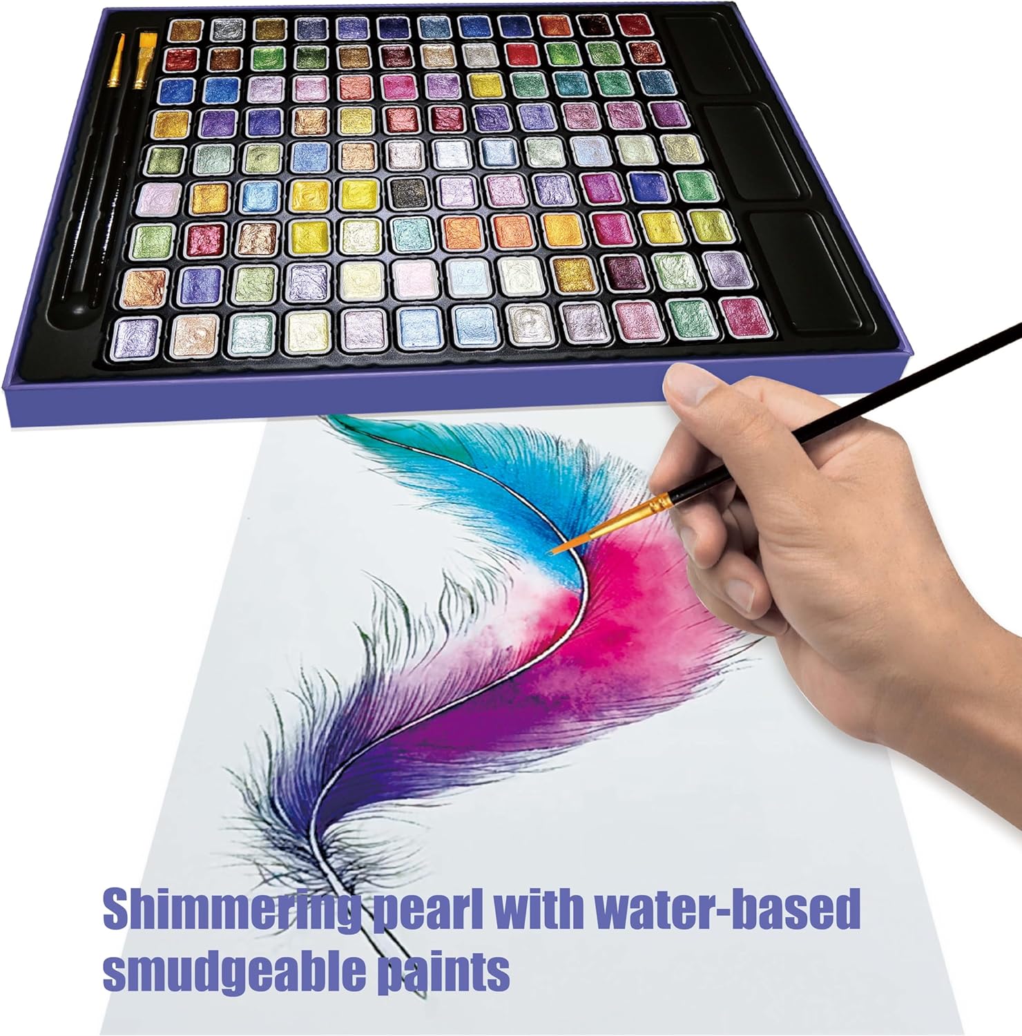 Mini Shimmer Watercolor Paint Set, 108 Colors Glitter Metallic Watercolour Painting Sets, Solid Pearl Water Color Paints for Artists, Amateur Hobbyists and Painting(108 Colors)