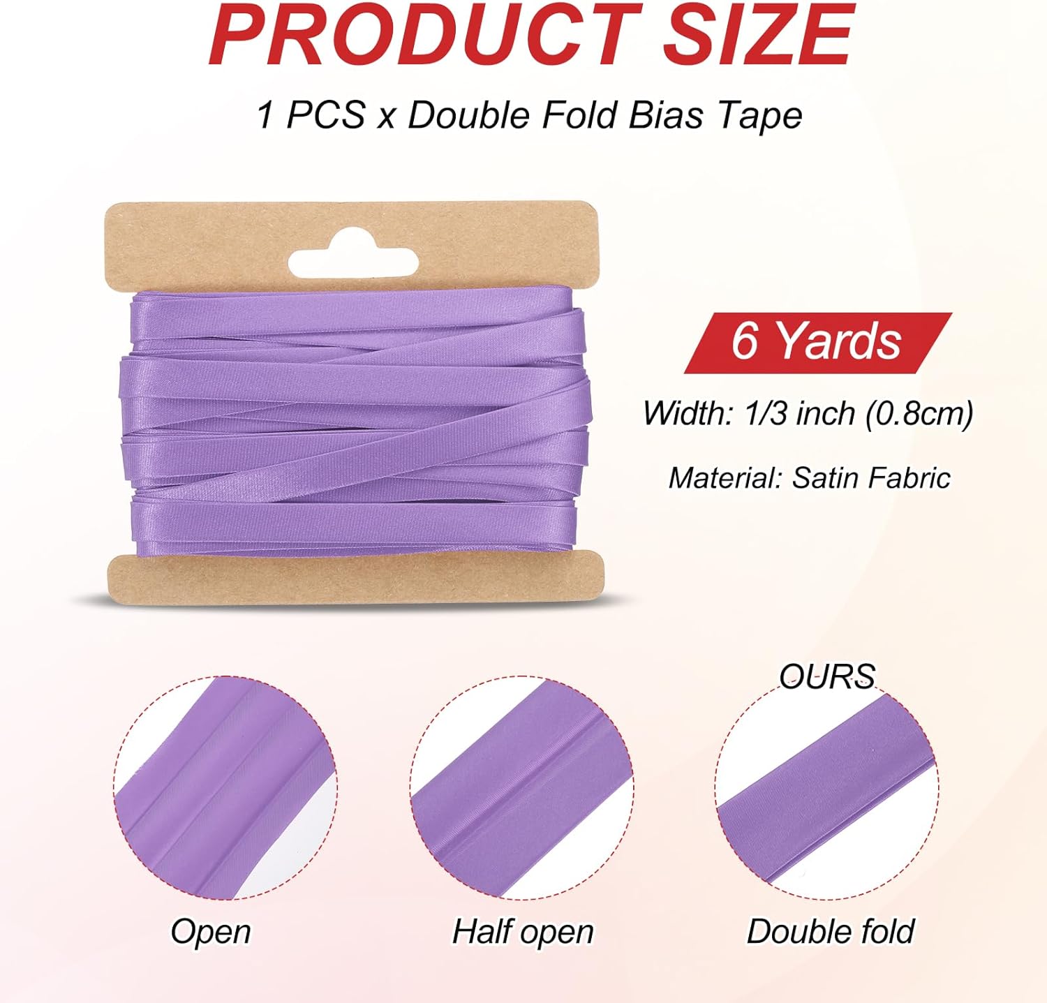 - Package contains: 1 x Double Fold Bias Tape; Width: 1/3 inch (0.8cm); Length: 6 Yards; Color: Light Purple; Material: Satin Fabric