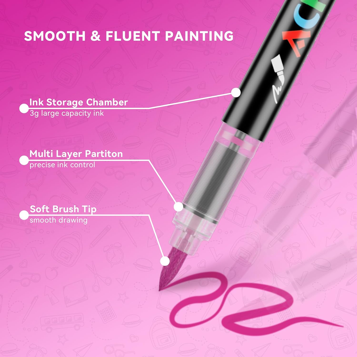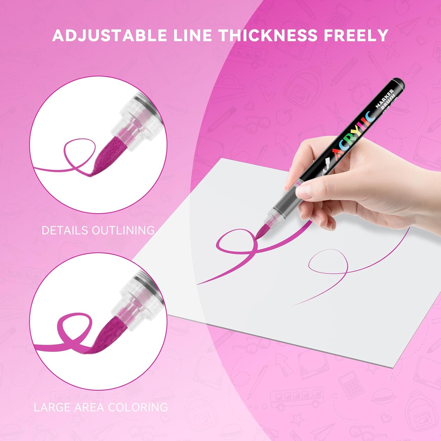 - 【Adjustable Brush Tip】 Acrylic marker brush tips feature high-elastic fiber material for sensitive pressure control—delivering precise 0.5mm fine lines with light strokes and expanding to 5mm wide with firm pressure. The split-fiber design mimics real brush effects, ideal for gradients and calligraphy
