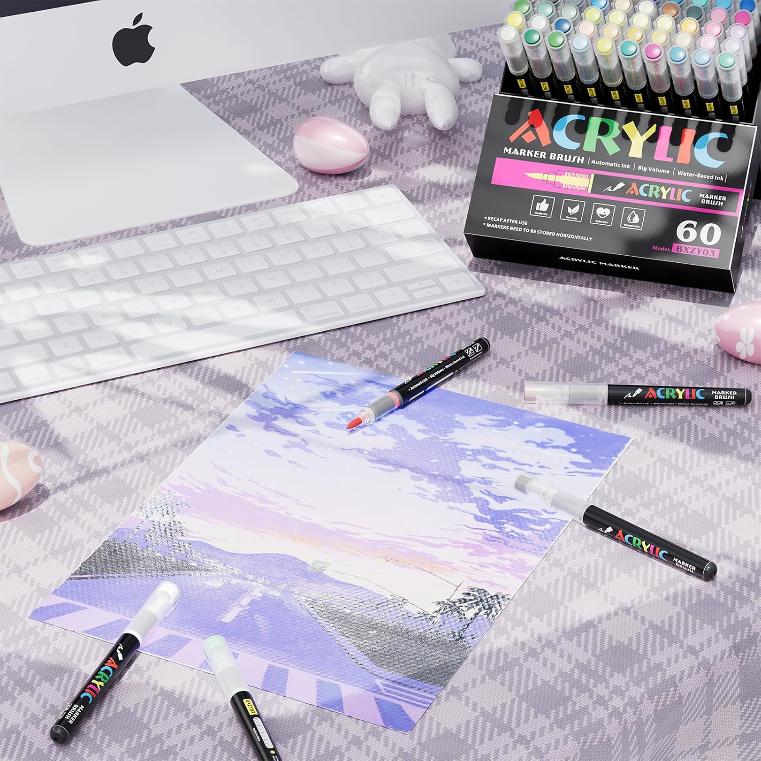 60 Colors Acrylic Marker With Brush Tip Automatic Ink Control, Water Based Ink Paint Markers For Rock Painting, Canvas, Wood, Ceramic, Glass, Stone, Fabric, DIY Crafts Textile & Art Supplies
