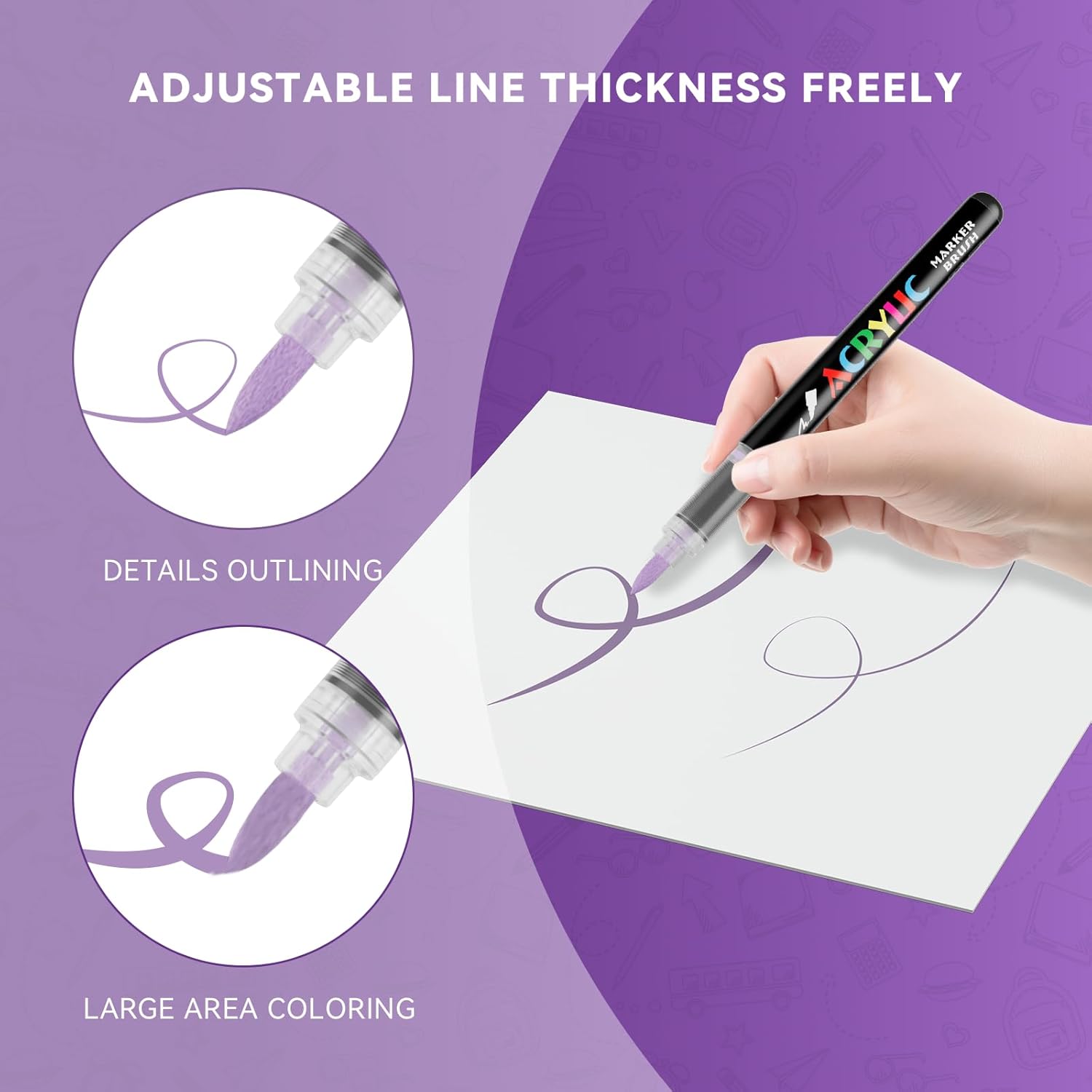 - 【Adjustable Brush Tip】 Acrylic marker brush tips feature high-elastic fiber material for sensitive pressure control—delivering precise 0.5mm fine lines with light strokes and expanding to 5mm wide with firm pressure. The split-fiber design mimics real brush effects, ideal for gradients and calligraphy