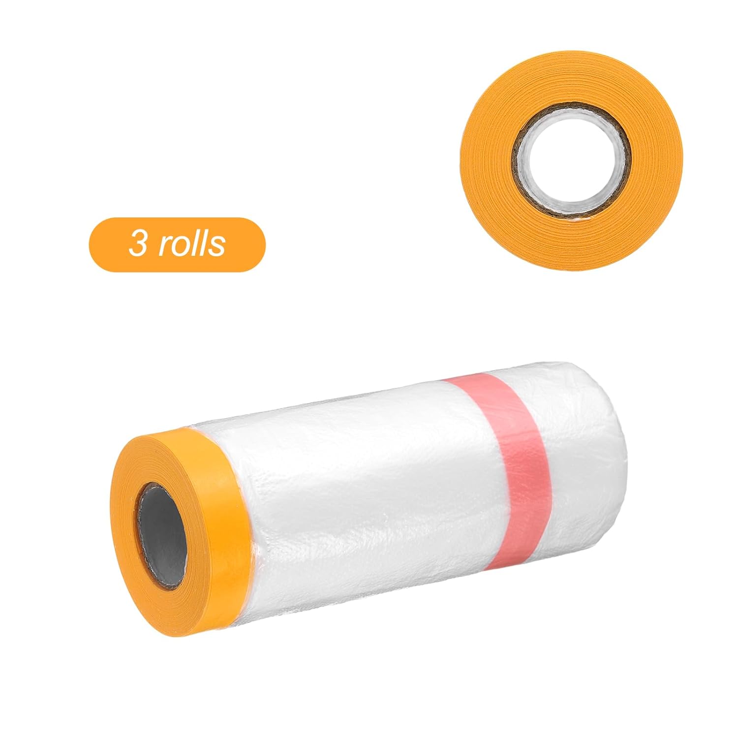 HARFINGTON 3 Rolls Pre-Taped Masking Film 43.3" x65.6ft Double Adhesive Tape and Drape Painters Plastic Drop Cloth Film with Tape Plastic Sheeting for Automotive Painting Covering