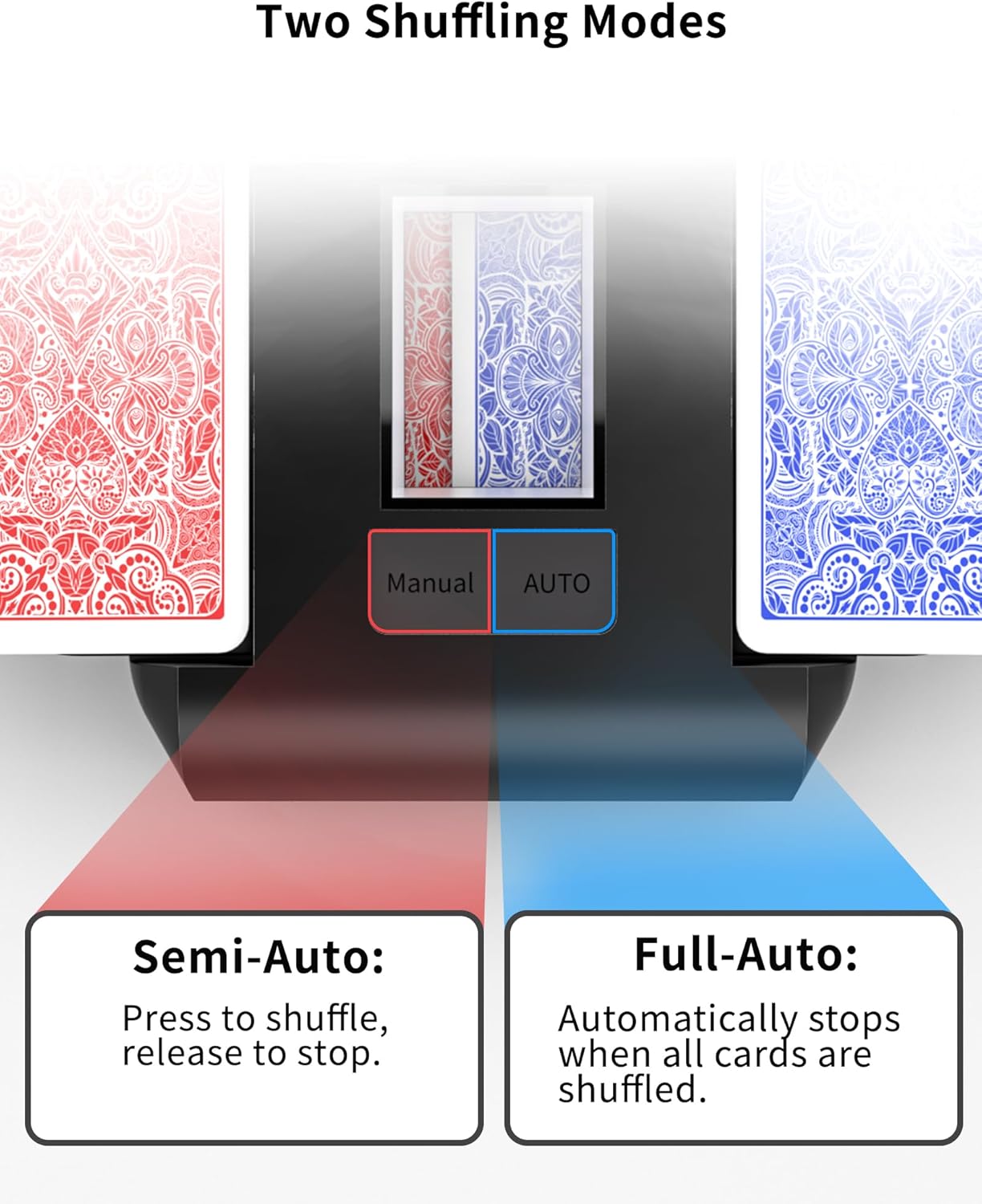 - 【Full-Auto & Semi-Auto Shuffle Modes】 In Full-Auto mode, a single press shuffles all cards and stops automatically. For precise control, Semi-Auto mode lets you hold to shuffle and release to stop.