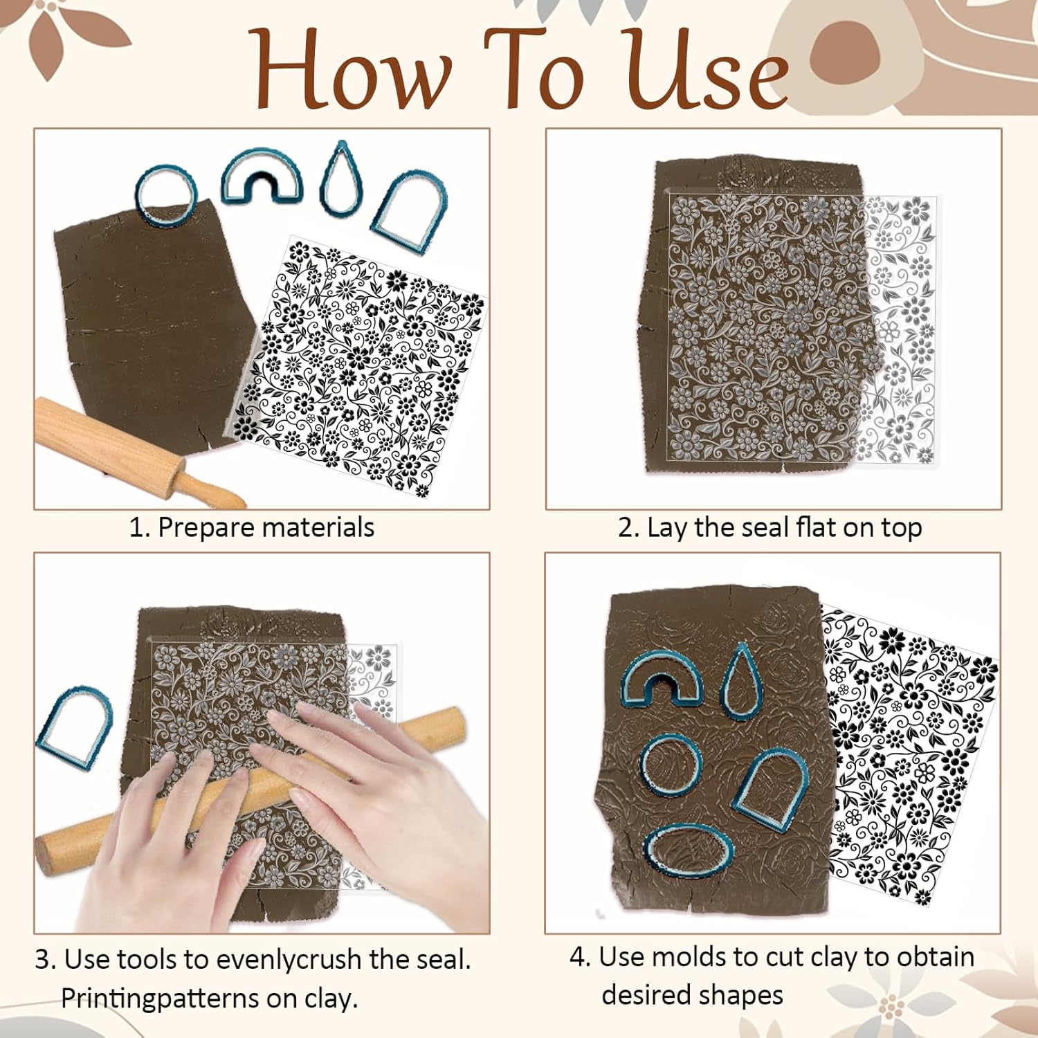 - Vine Flowers Design: This clay texture mat features a vine flowers design that is simple and elegant intricate detailing and clean lines. There are elements of vine flowers pattern, curly plants, leaves, etc. Crafted with precision to add unique flair and artistic depth to your DIY projects