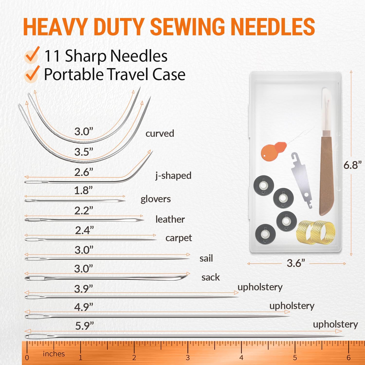 - SET INCLUDES: 4 rolls of black waxed threads and 11 heavy-duty needles: short and long upholstery needles, curved needles, j-shaped, sail, carpet, leather, glovers, and sack needles. Features threaders, thimbles, and a seam ripper