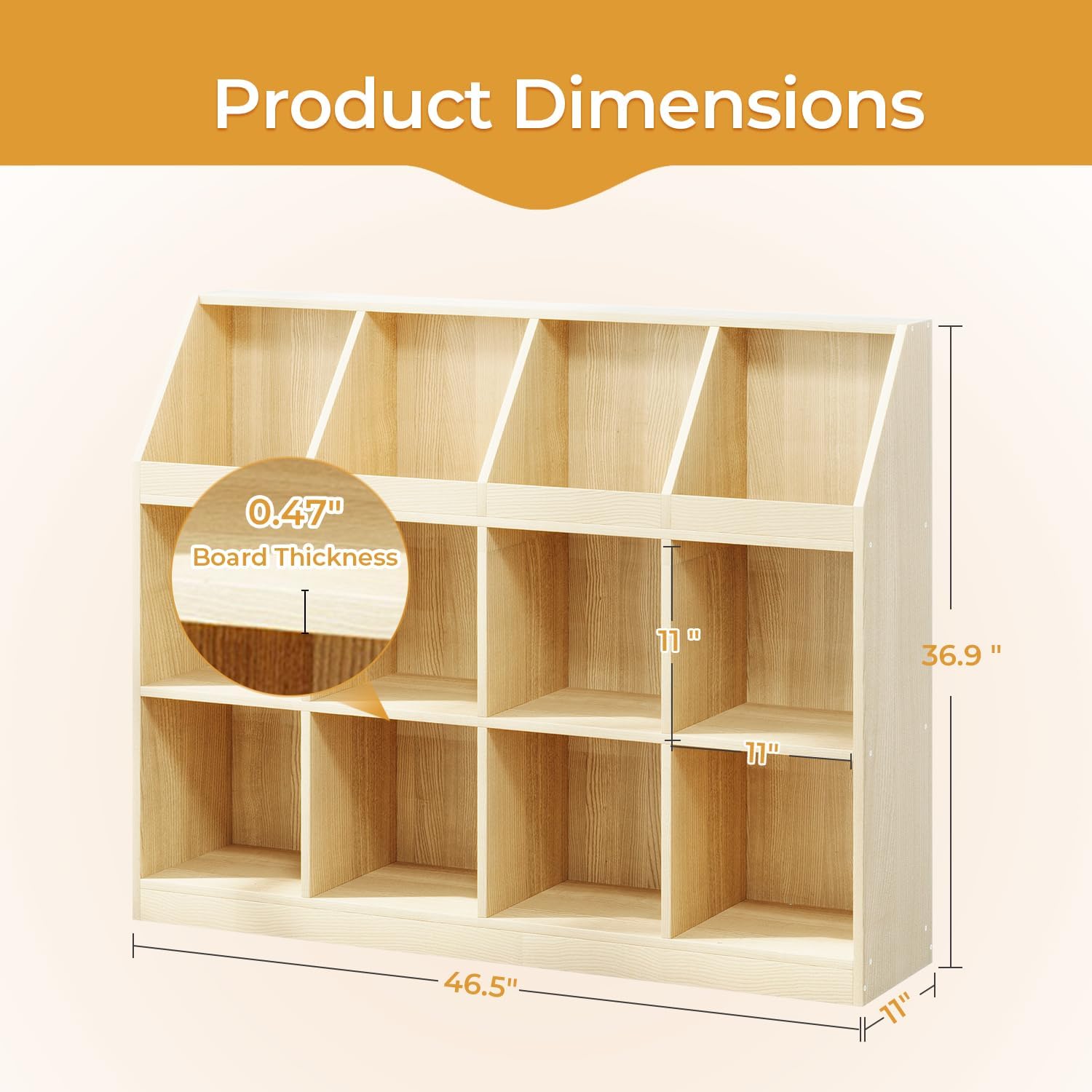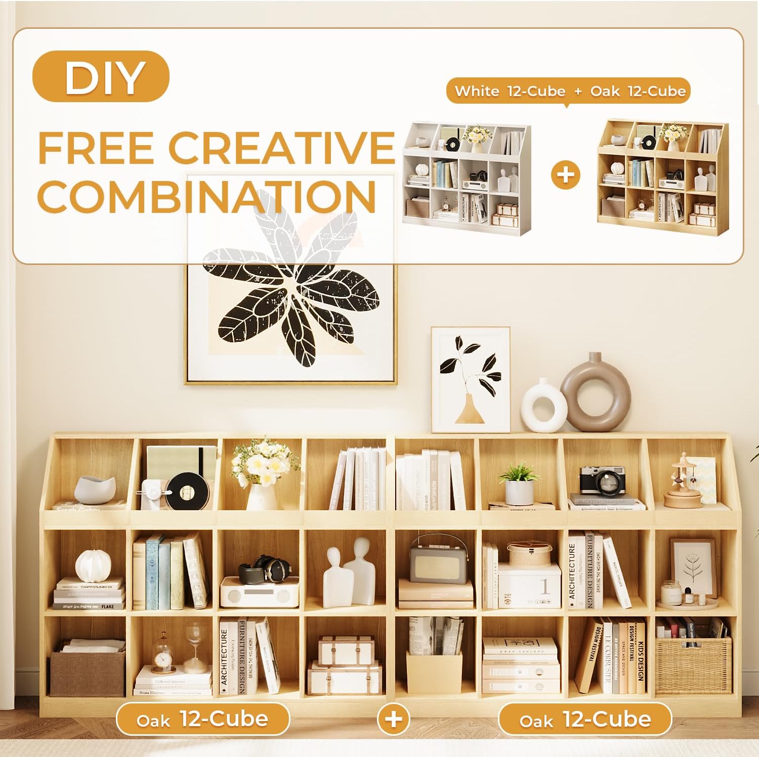 12-Cube Wooden Storage Bookcase - 11-Inch Open Shelf Cabinet, Simple Modern Bookshelf Organizer for Home Office, Living Room, Oak