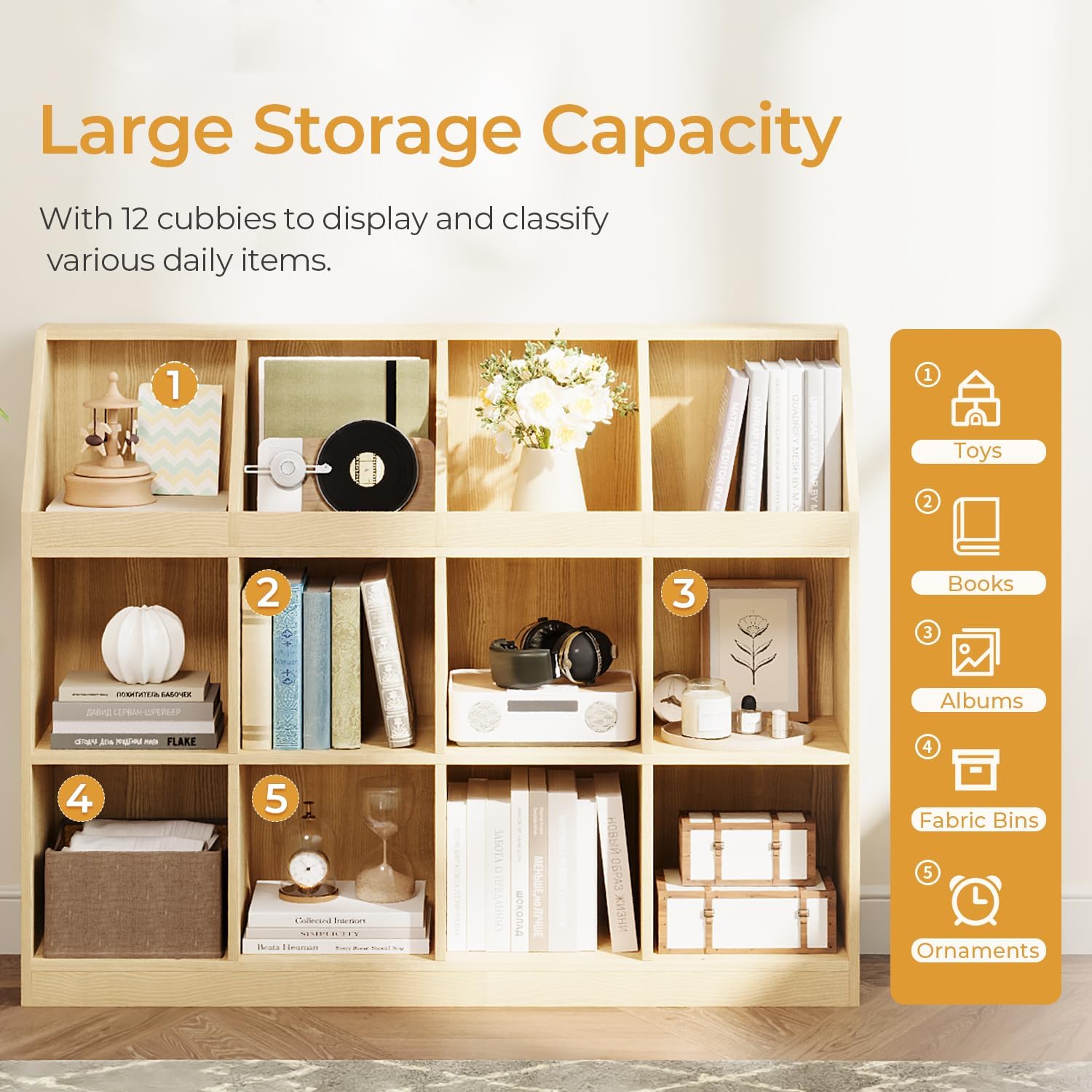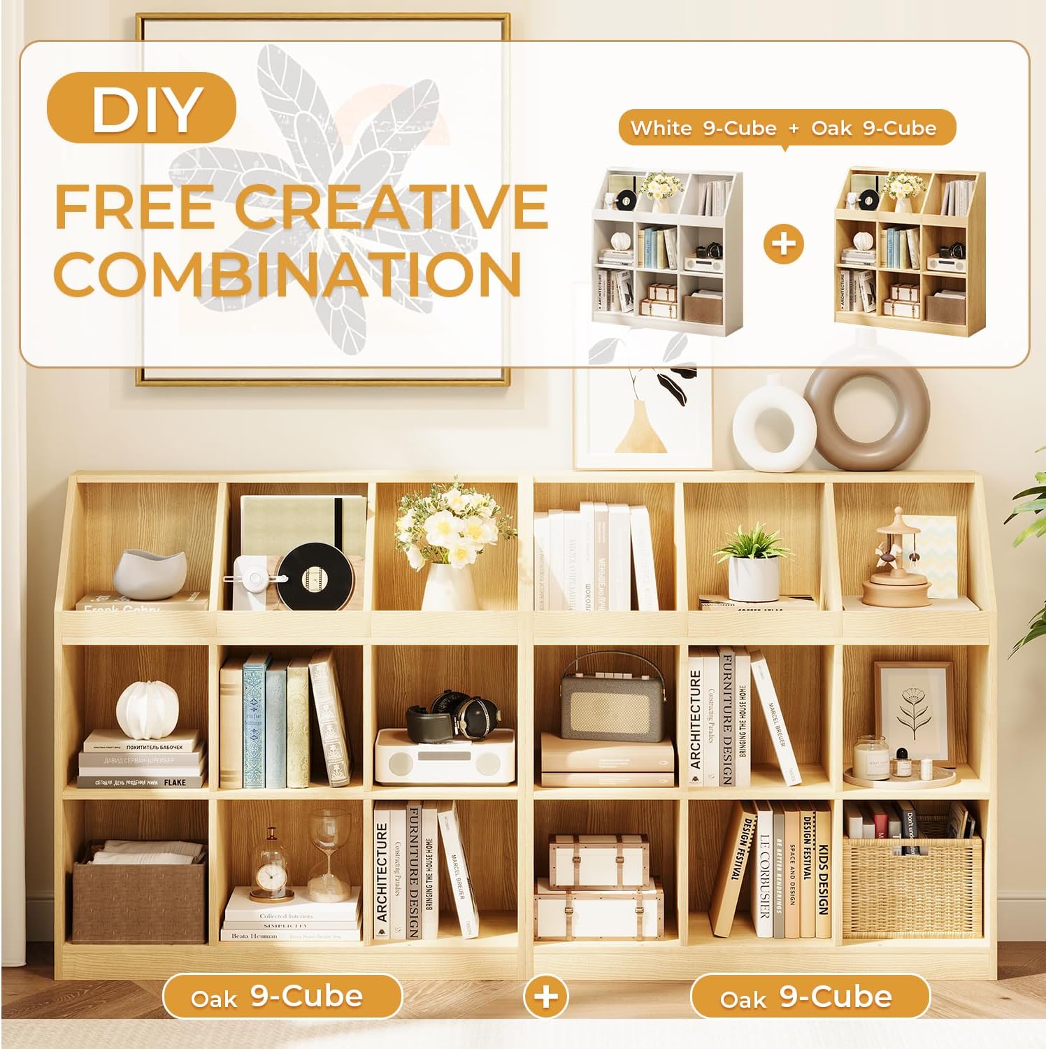 9-Cube Wooden Storage Bookcase - 11-Inch Open Shelf Cabinet, Simple Modern Bookshelf Organizer for Home Office, Living Room, Oak
