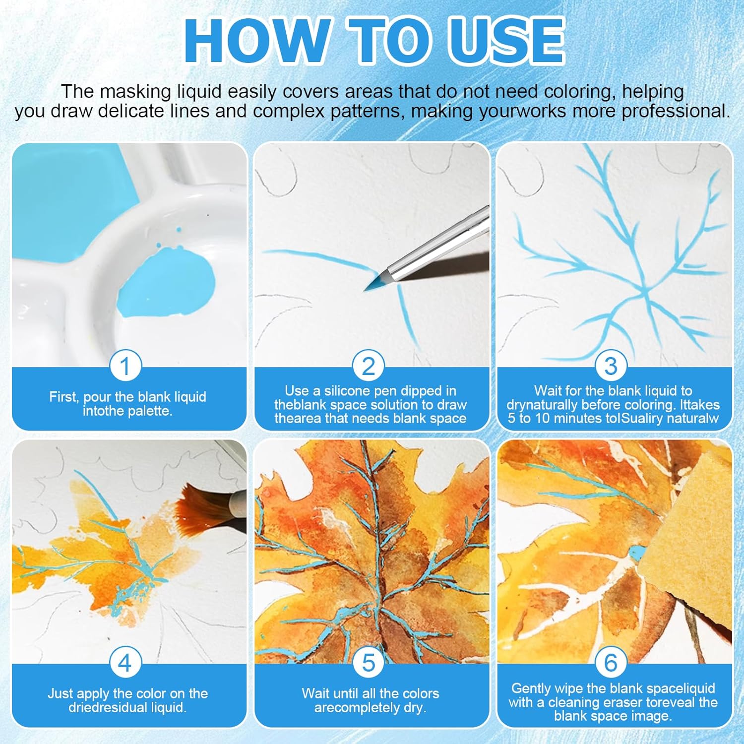 - Widely Used: Art masking fluid suitable for watercolor painting fine blank space requirements, multi-layer superposition painting, large area and detail combination, special technique creation, beginner practice.