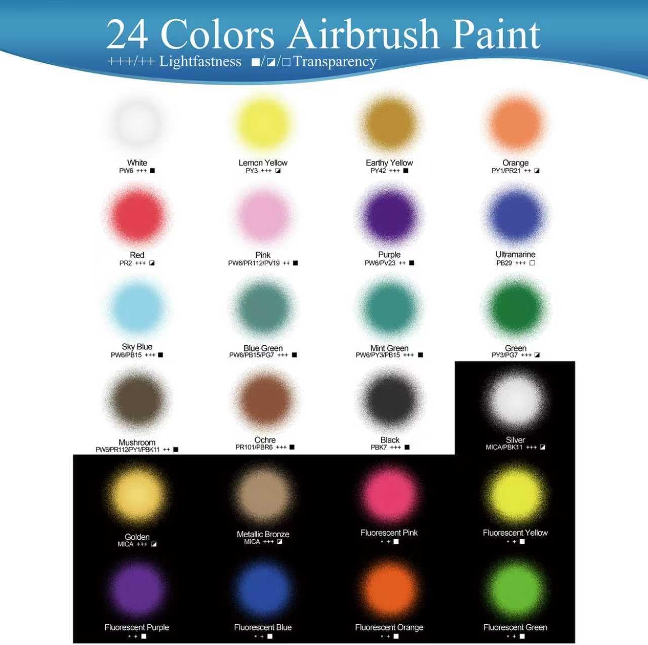 - 【Rich Color Airbrush Paint Set】- PENTRISTA Airbrush paint set with 98% pigment concentration deliver museum-quality depth, outperforming standard craft paints in opacity and color vibrancy.It's contains 24 colors(2.03 Fl.oz/ 60 ml):including 15 common colors, 6 fluorescent colors, 3 metallic colors,also comes with 2pcs(4.06 Fl.oz/120ml) airbrush thinner.Each air brush color has wonderful air brush flow characteristics.The water-based spray paint is versatile and can fulfill your painting needs.