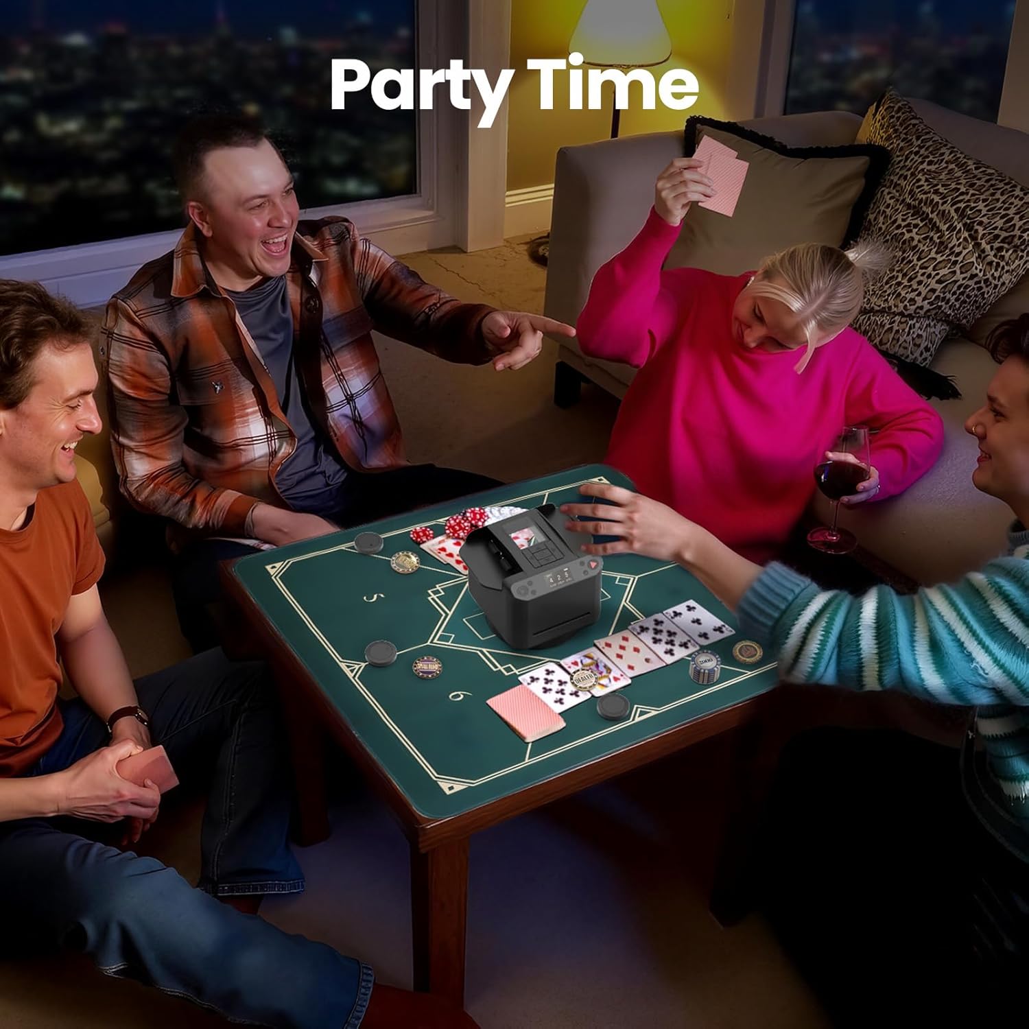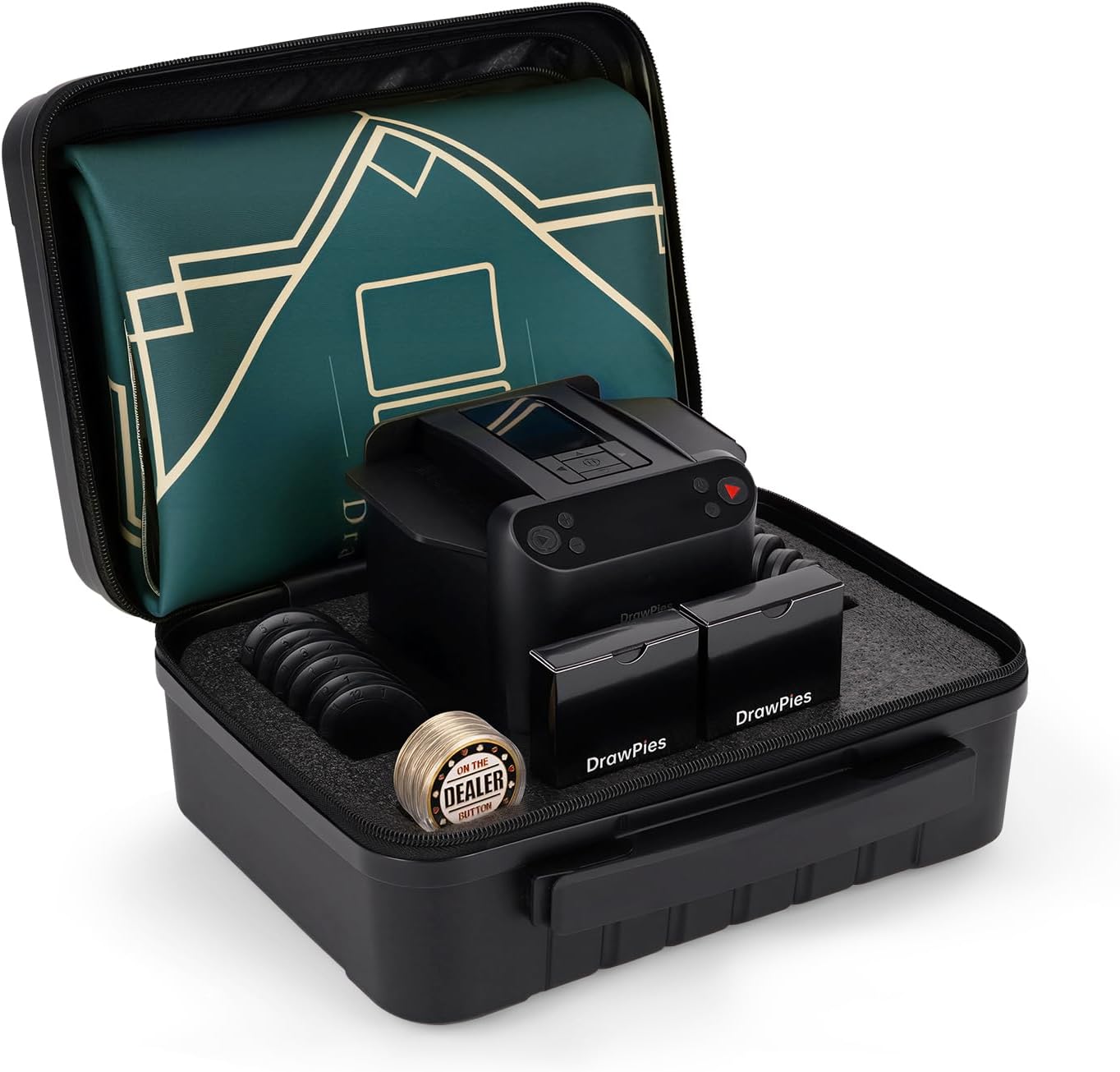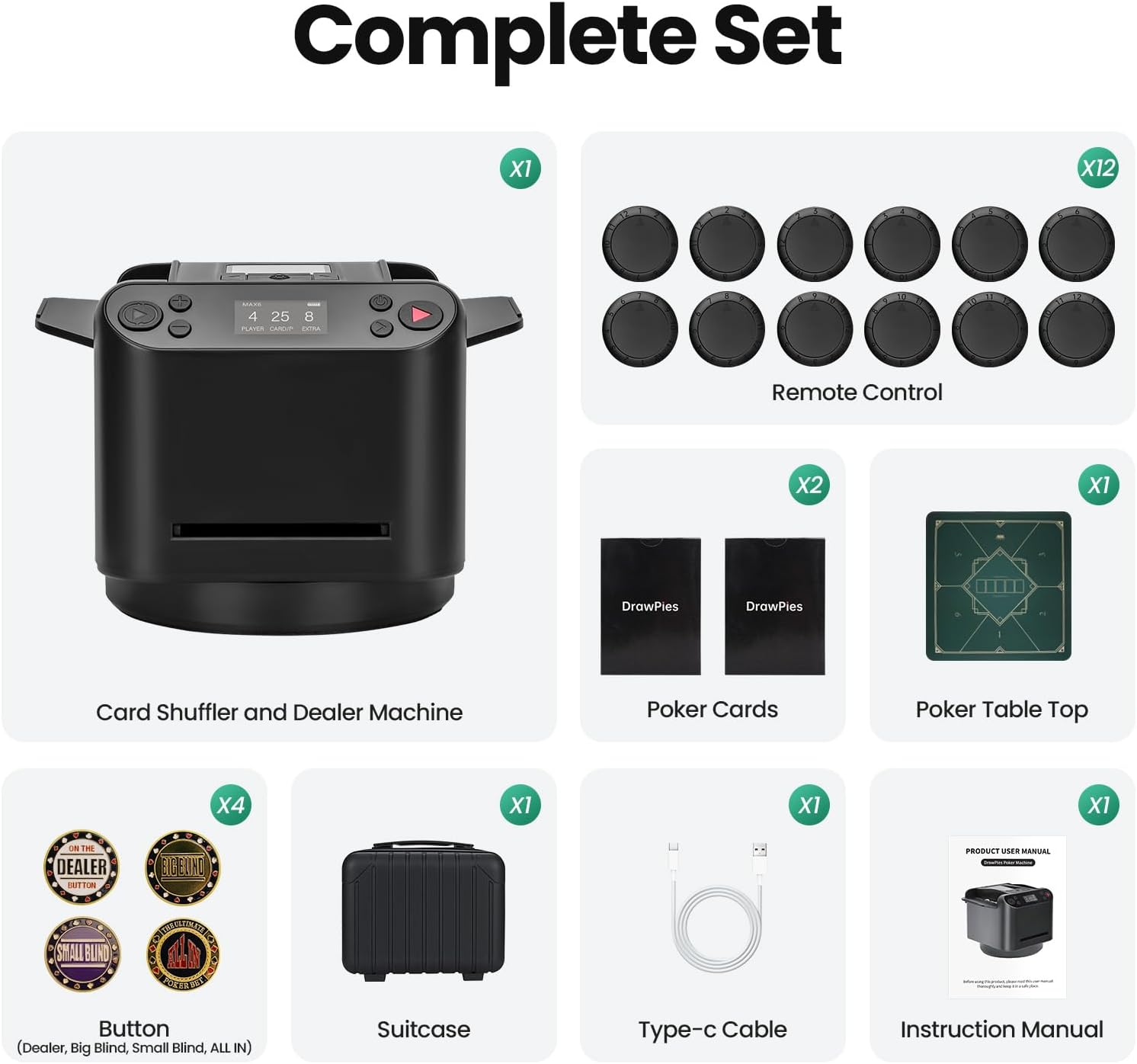 - [Package Includes] Card Shuffler and Dealer Machine*1, Type-c Cable*1, Type-c Cable*1, Remote Control*12, Poker Cards*2, Poker Table Top*1, Button*4 (Dealer, Big Blind, Small Blind, ALLIN) ,Suitcase*1. The compact and portable armrest box is perfect for travel and parties, while its simple appearance also makes it a no-brainer gift for poker lovers.