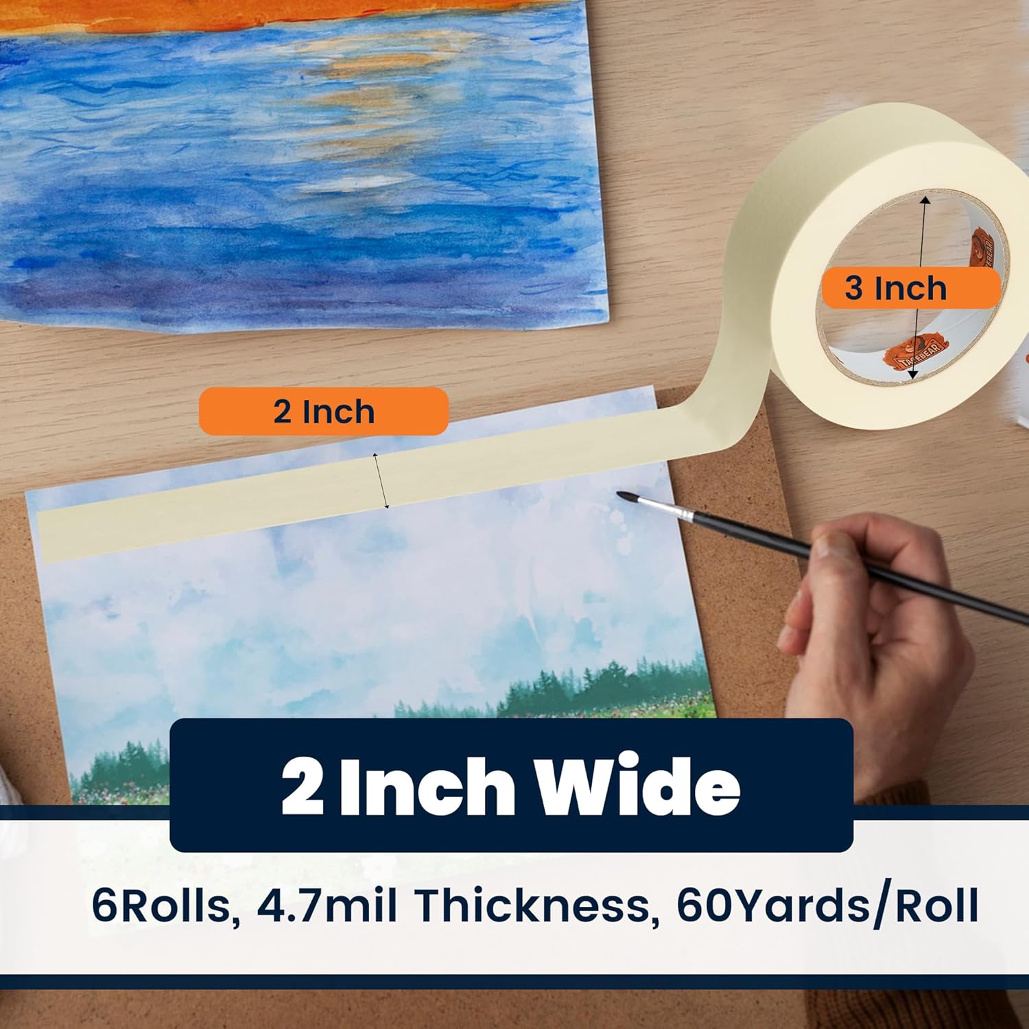 - ONE PACK, 6 ROLLS: Our general purpose beige white paint tape set comes with 36 rolls. The thickness of masking tape is 4.7mil, each roll measures 2 inches in width and 60 yards in length. Long enough for your different needs. Great for crafts, arts, DIY projects, organizing, decorating etc.