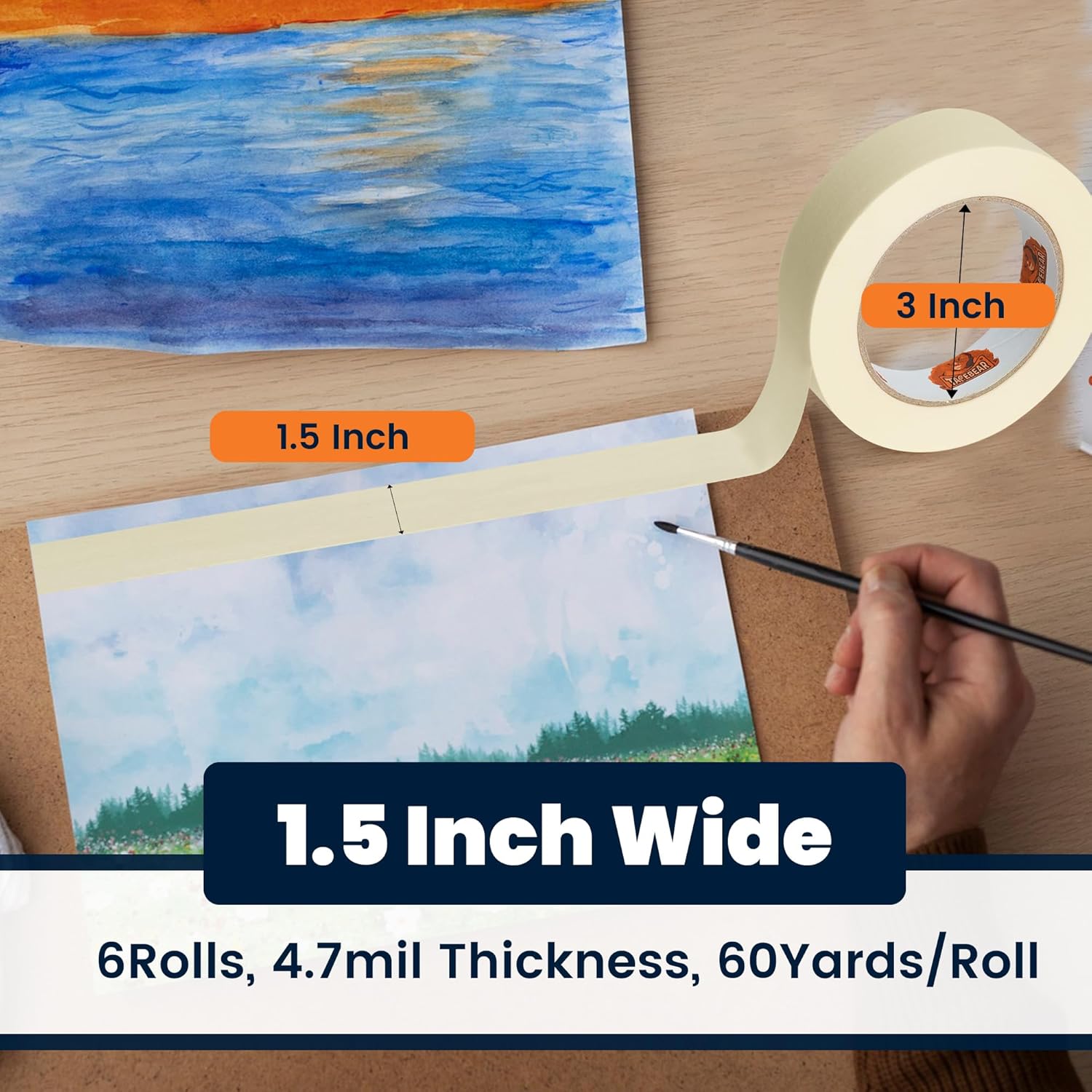 - ONE PACK, 6 ROLLS: Our general purpose beige white paint tape set comes with 6 rolls. The thickness of masking tape is 4.7mil, each roll measures 1.5 inches in width and 60 yards in length. Long enough for your different needs. Great for crafts, arts, DIY projects, organizing, decorating etc.