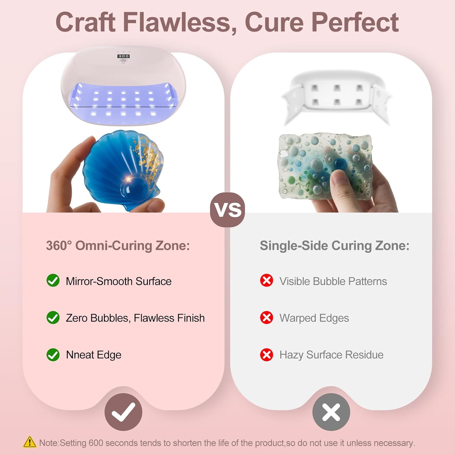 - 360° Ring Light–Powerful & Even UV Curing: Equipped with a high-power 360-degree UV LED ring,this large curing lamp for uv resin delivers uniform light distribution for faster and smoother resin hardening.Ideal for UV resin jewelry,keychains, nail art,coasters,domino molds,resin trays, polymer clay earrings,and other resin moldes.