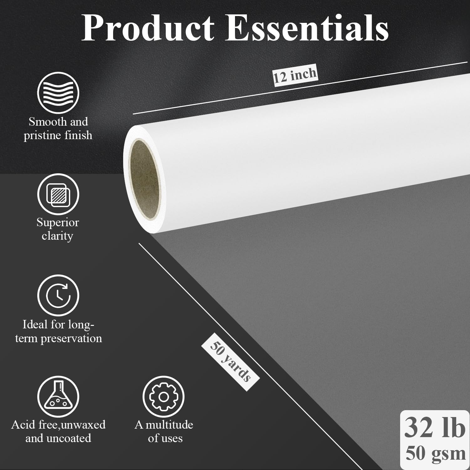 SuFly Tracing Paper Roll, 12 Inch x 50 Yards Trace Paper Roll, 32 lb White Art Paper Translucent Pattern Paper for Sewing, Drawing, Sketching, and Gift Wrapping.