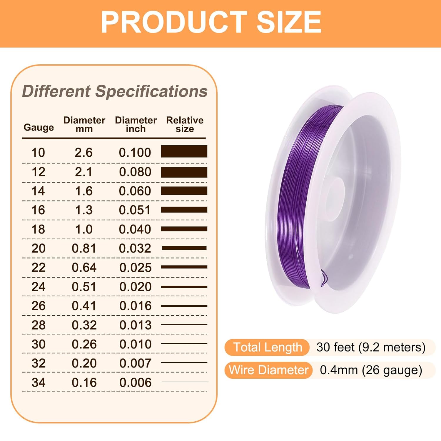 - Size - The diameter of the art wire is about 0.4mm (26 gauge) and 30 feet (9.2 meters) long. The art wire is suitable for jewelry making, beading, and jewelry repair.