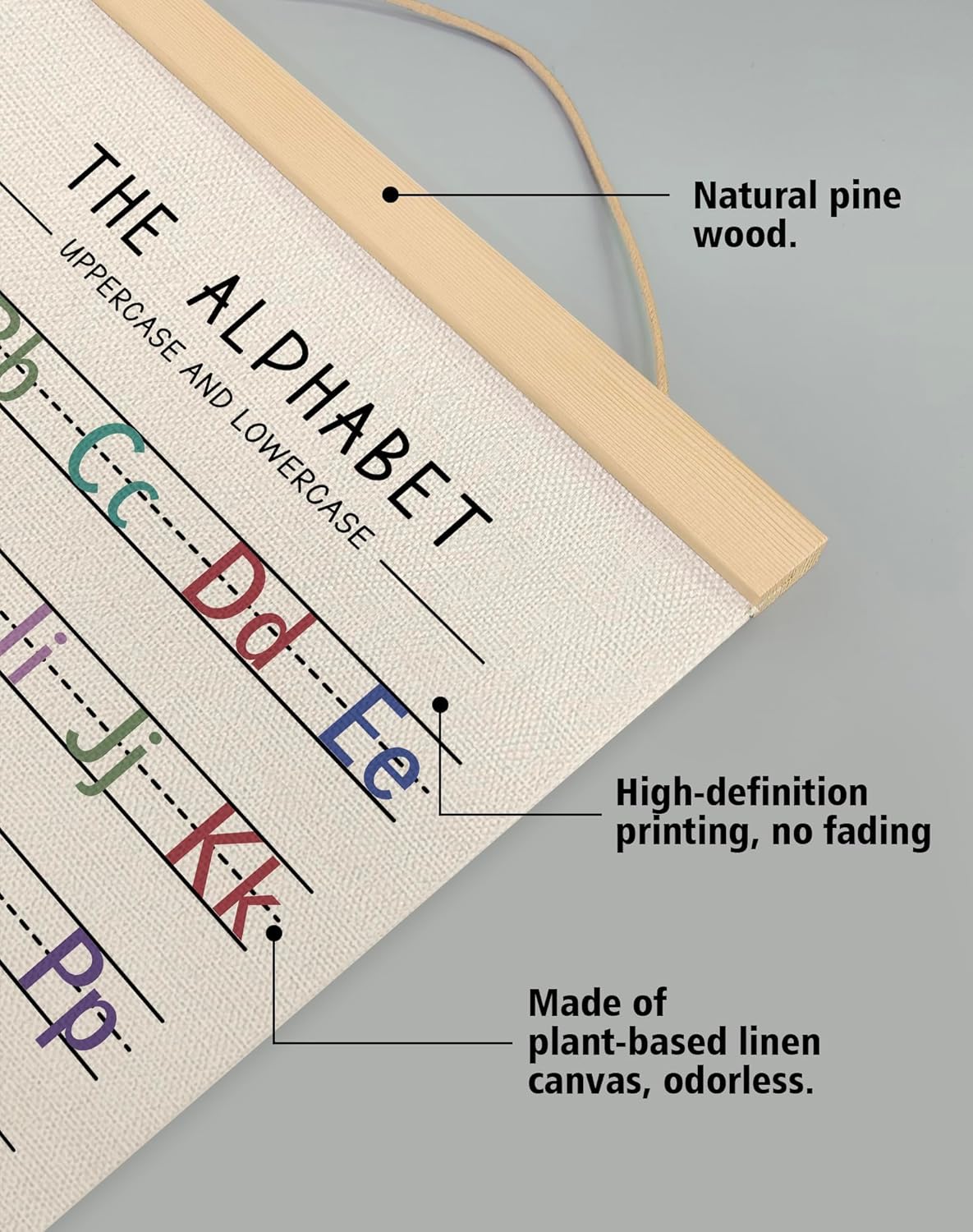 - Material & Ideal Size:Natural Linen,14 x 18.5 inches, Set of 2,one alphabet poster and one numbers 1–20 chart ,a full learning combo.These alphabet and number posters are printed on premium natural linen fabric, giving a rustic yet elegant texture.