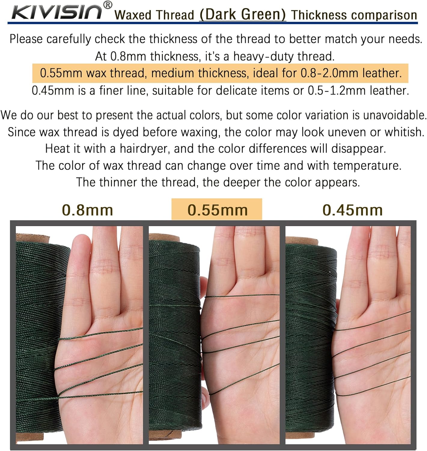 - KIVISIN 0.55mm waxed leather thread is of medium thickness and is widely used for leather sewing, stitching, book binding, shoe repairing, hanging, wrapping, knotting, beading, crafting, micro braiding, bracelet making, upholstery and micro macrame Jewelry making