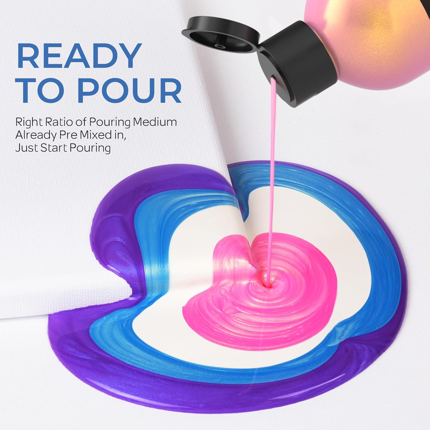 - Large Volume Pour Paint: This acrylic pouring paint kit comes with 8 colors iridescent metallic acrylic pour paint with large volume 8.45 oz / bottle. Ready to pour acrylic paint has the right ratio of pouring medium already mixed in, perfectly formulated to tilt, swipe, and puddle