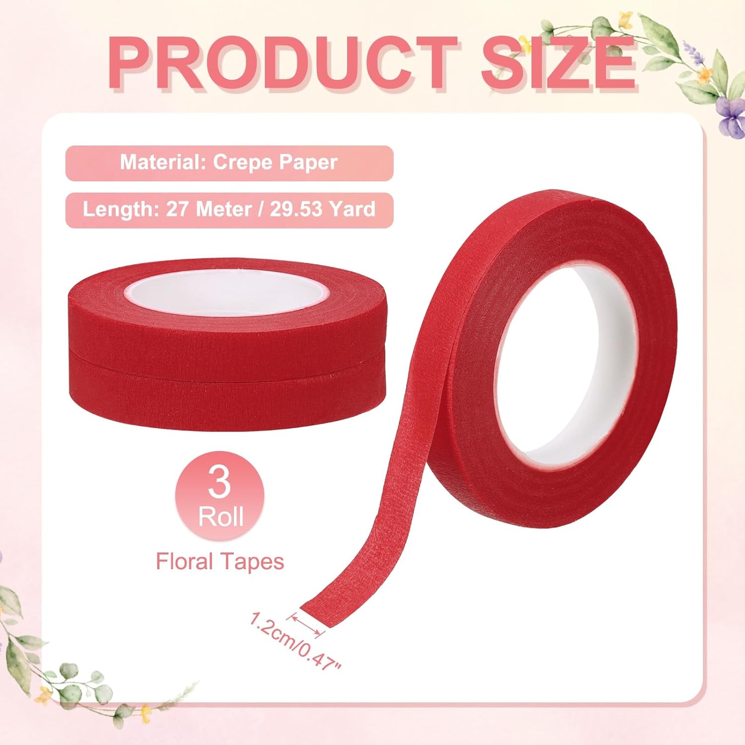 - Color: Red; Material: Crepe Paper; Length: 27 Meter / 29.53 Yard; Width: 1.2 cm/0.47 Inch; In the package of: 3 Rolls x Floral Tapes