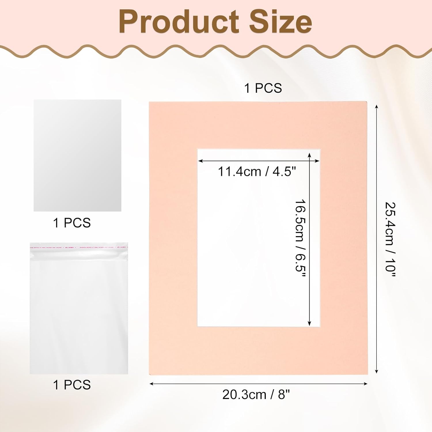 - [Picture Mats] Material: Cardboard; Color: Lotus Root; Total Size: 20.3 x 25.4 cm / 8" x 10"; Bevel Cut Opening Size: 11.4 x 16.5 cm / 4.5" x 6.5"(L*W); Fit Picture Size: 5" x 7"; Package Content: 1 Pcs x Picture Mats; 1 Pcs x Backing; 1 Pcs x Clear Bag