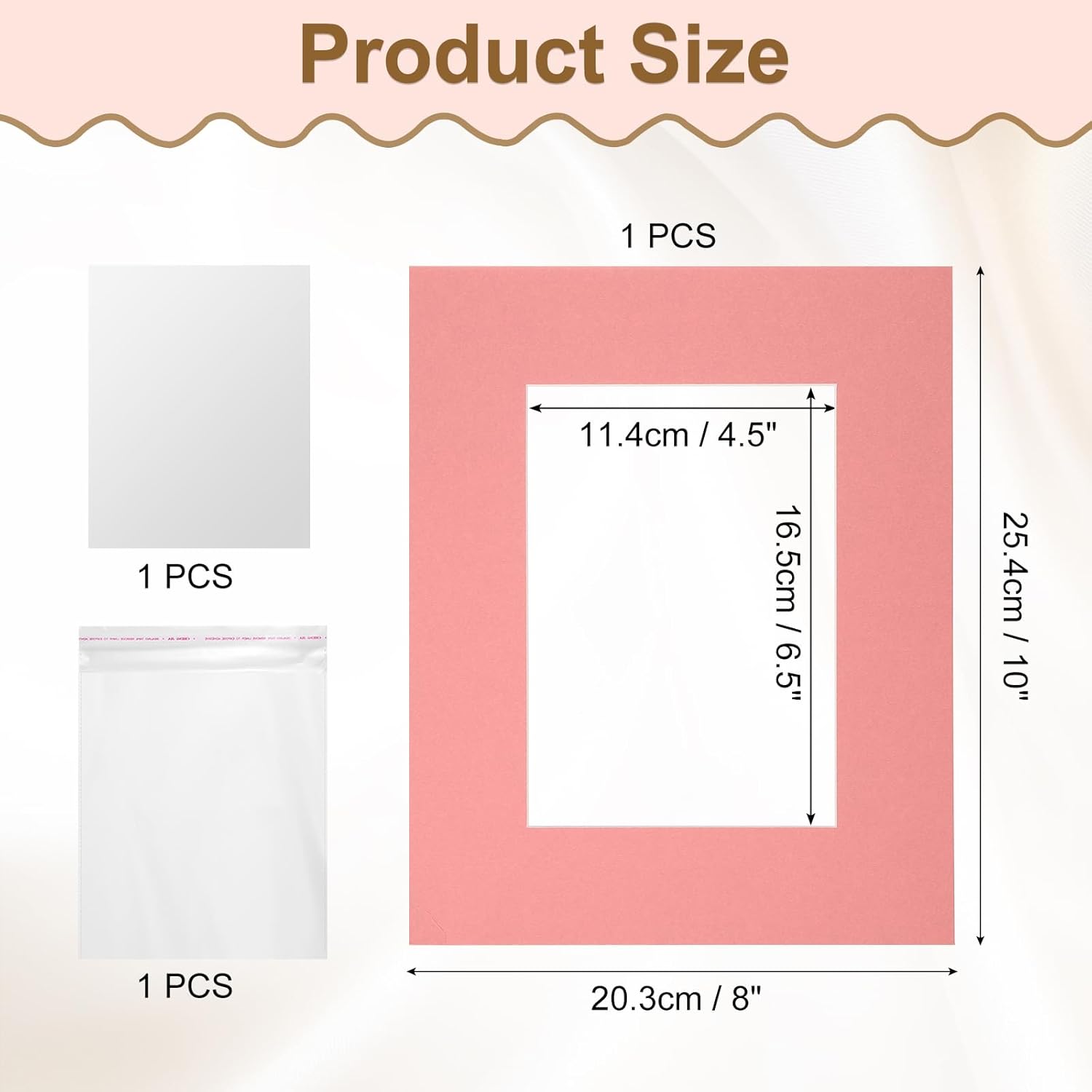 - [Picture Mats] Material: Cardboard; Color: Pink; Total Size: 20.3 x 25.4 cm / 8" x 10"; Bevel Cut Opening Size: 11.4 x 16.5 cm / 4.5" x 6.5"(L*W); Fit Picture Size: 5" x 7"; Package Content: 1 Pcs x Picture Mats; 1 Pcs x Backing; 1 Pcs x Clear Bag