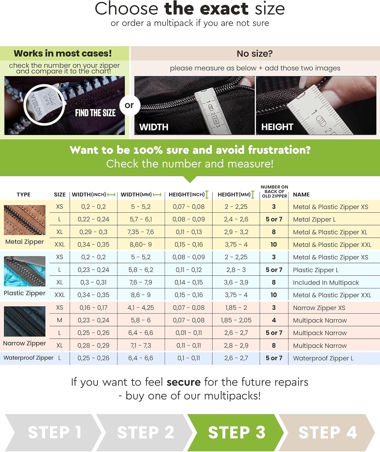 - Zippers included in the multipack: For Waterproof Zippers: M (4C2); L (5C2)