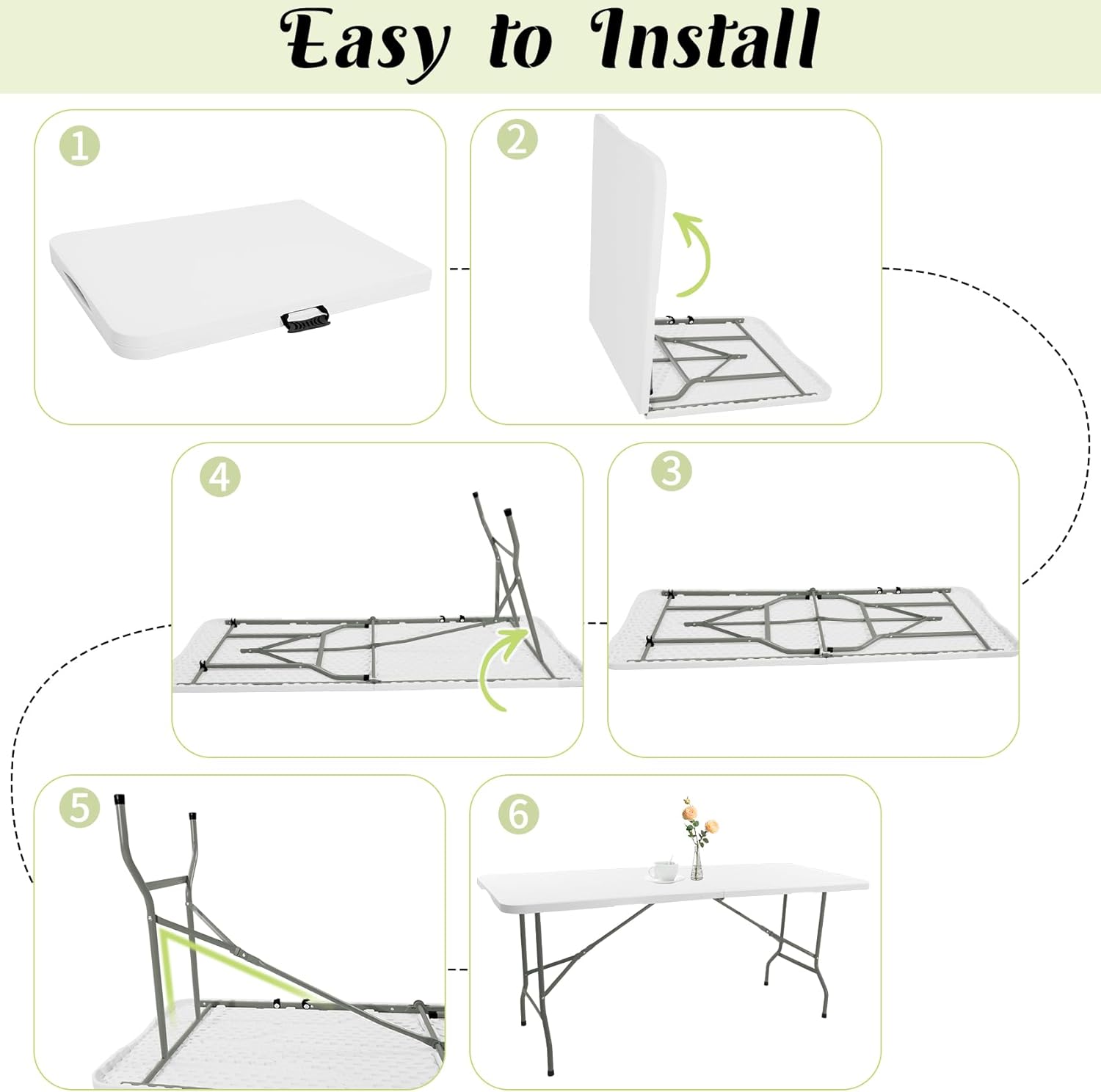 2 Pack 6 FT Folding Tables White Foldable Table, Fold-in-Half with Carrying Handle Portable Plastic Rectangular Table for Party, Dining, Wedding, Camping, Picnic, Indoor Outdoor Events