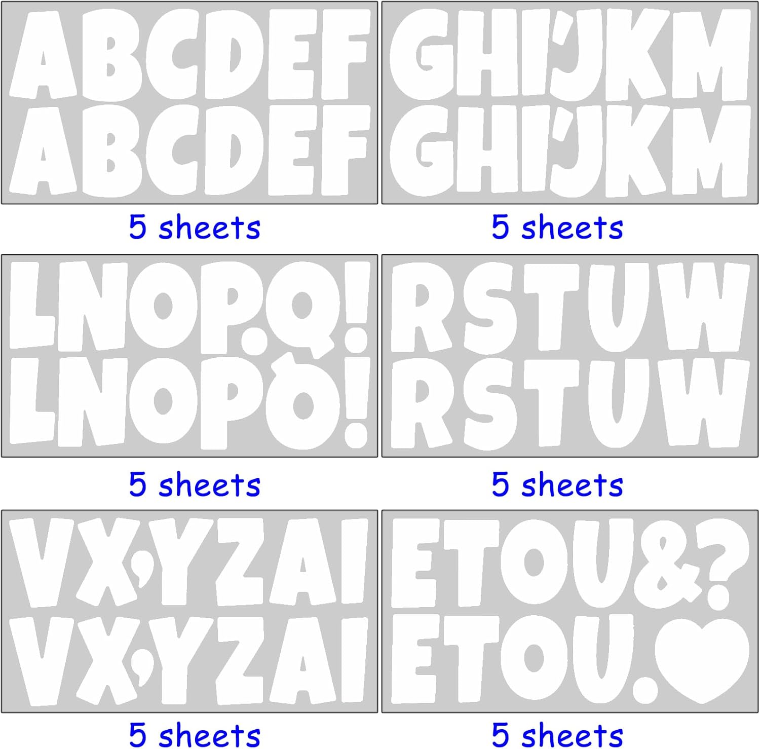 - Sufficient Quantity & Vinyl Material: Elevate your creative projects with this complete set of 310 pieces poster letters, and 50 punctuation stickers, total of 360 Pieces 30 sheets 2.5 inch sticker letters enough quantity to meet the need of classroom, bulletin board dรฉcor, craft projects and more. These sturdy poster board letters are made from durable vinyl material using a high quality printing process, and ensure long-lasting durability