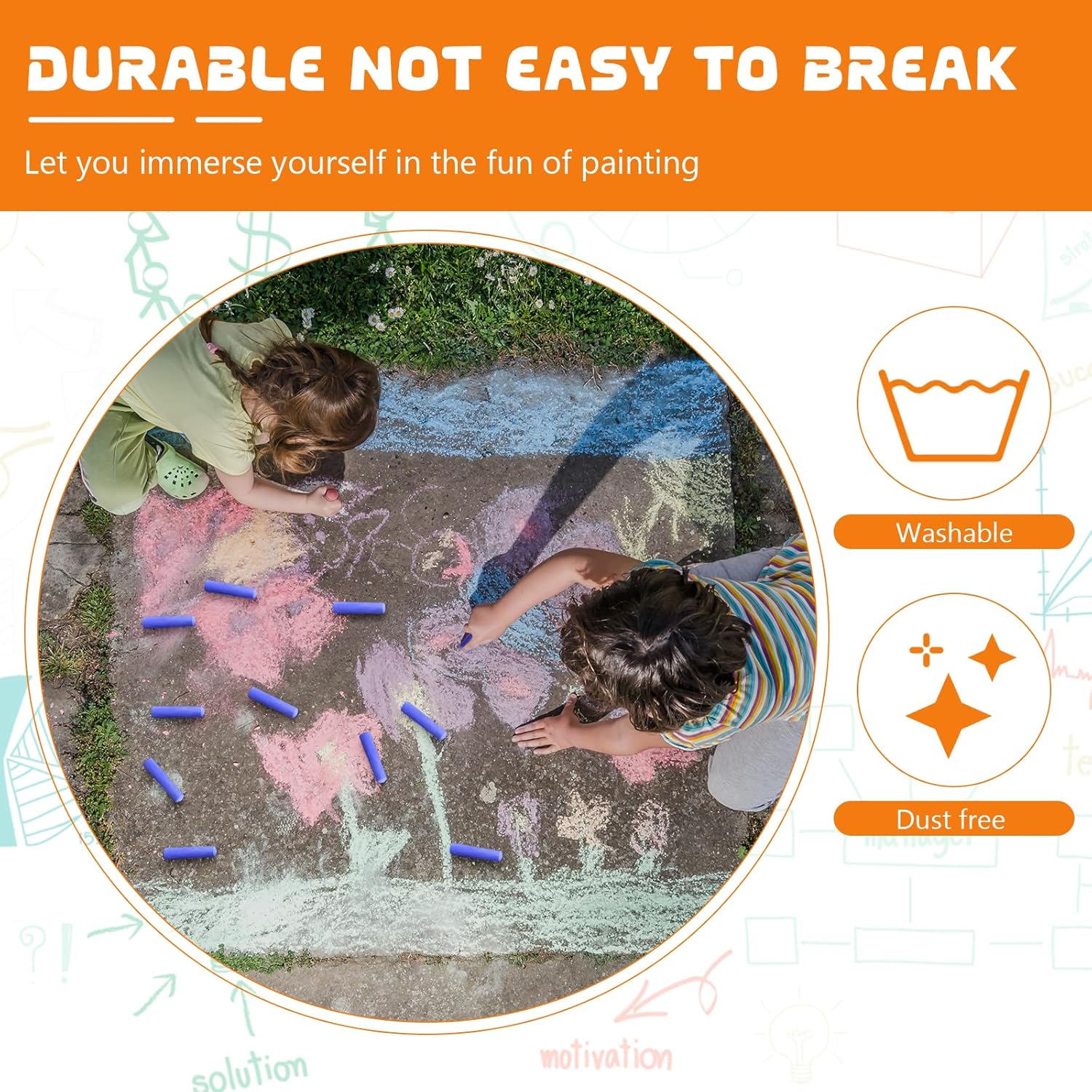 - Durable and long-lasting: each piece of chalk is designed to withstand outdoor. The thick sticks resist breaking easily, ensuring many hours of fun and creative expression for kids in any setting