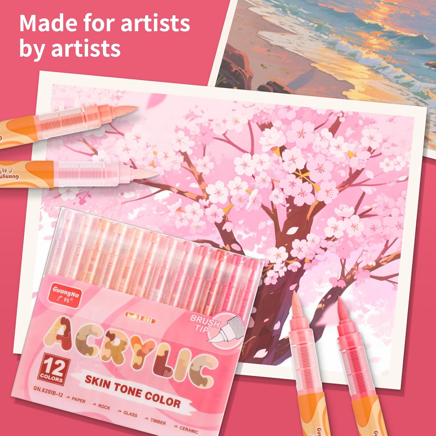 Guangna Acrylic Paint Markers 12 Colors, Skin Tone Series Set with Soft Brush Tip Water Based, Fine Tip Markers for Wood, Canvas, Rock Painting, Glass, Diy Crafts, Fabric Paint