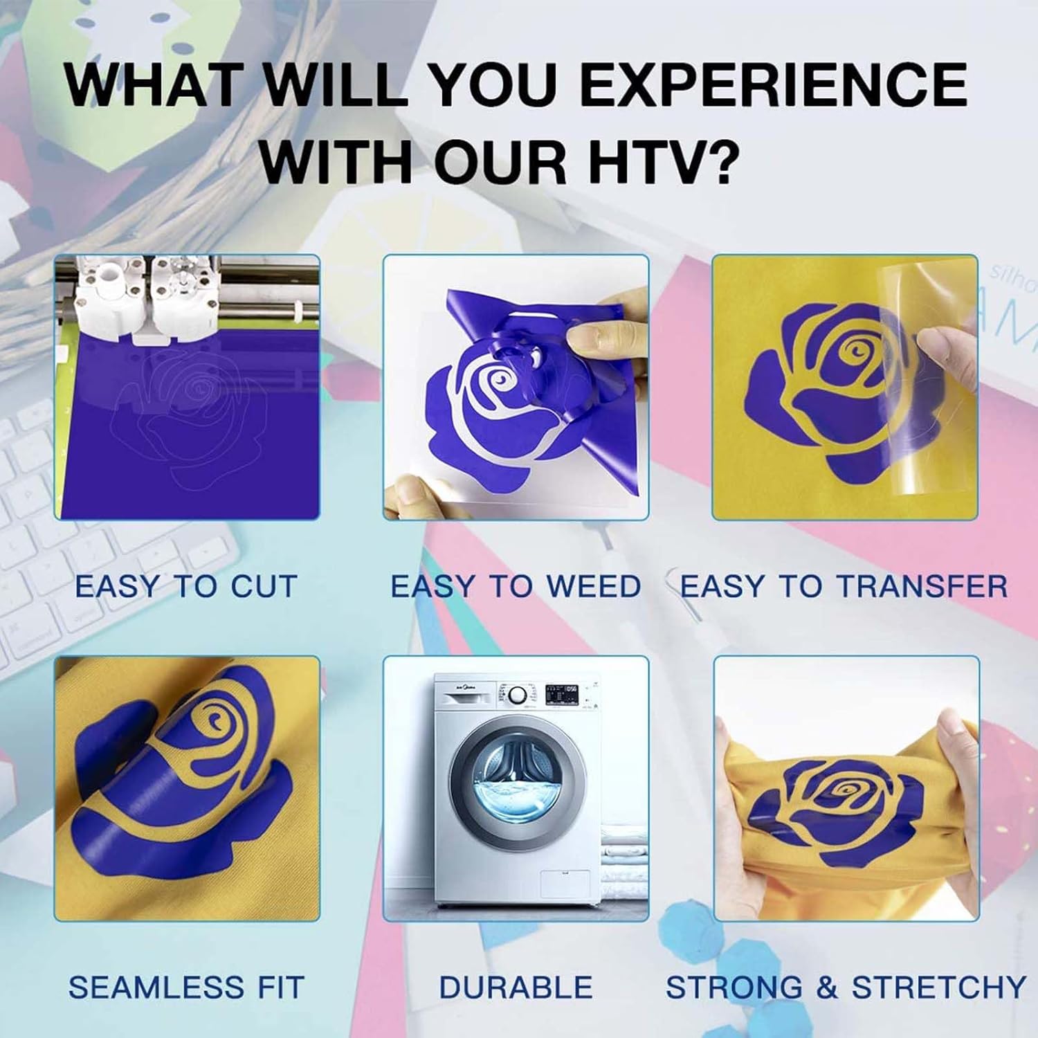 - 【Easy to Cut & Weed & Transfer】HTVRONT premium quality blue htv vinyl will save time which you may waste on each image or letter, because you can cut and weed easily through the designs just right. Iron on vinyl is sensitive to temperature and pressure, which can be heat transferred to any t-shirt easily. Before cutting, make sure the blade is clean and sharp, so that your design can be cut well and weeding can be done better