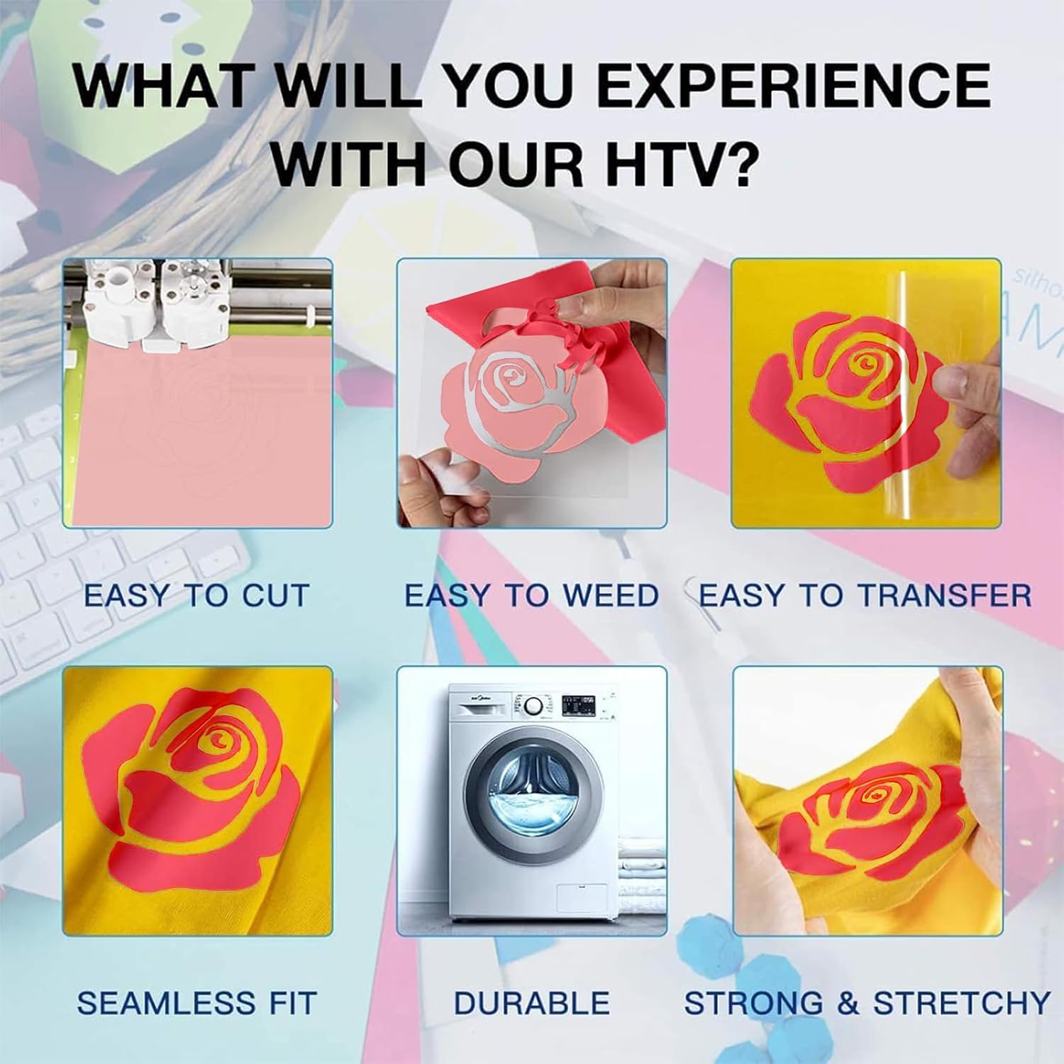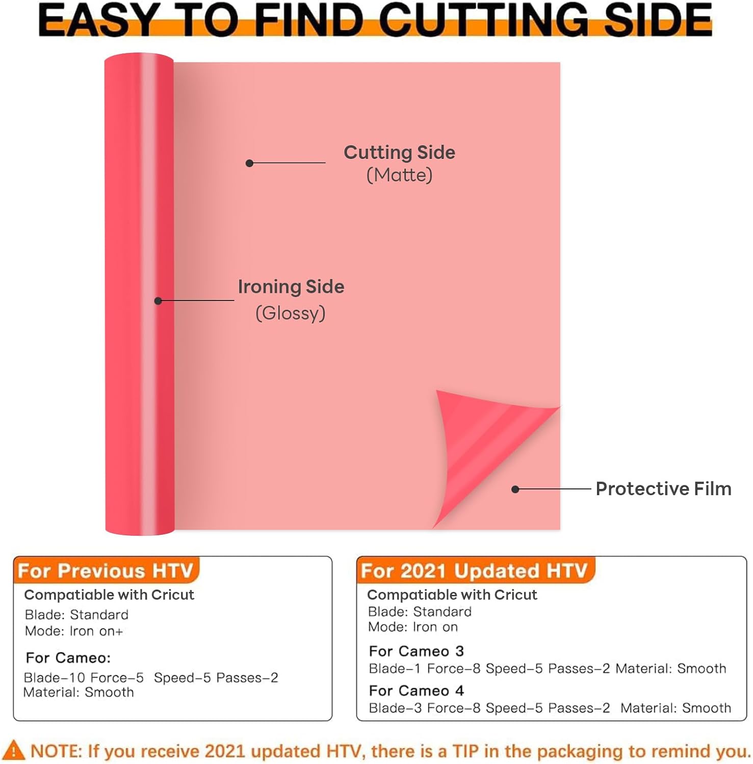 - 【12 INCH x 8 FEET】HTVRONT htv vinyl rolls are easy and convenient to cut into different sizes of art designs or logos or letters and perfect for 12''x12" and 12''x24" cutting mats. Our iron on vinyl are compatible for all cutter machines. The color of the featured image may vary depending on your screen